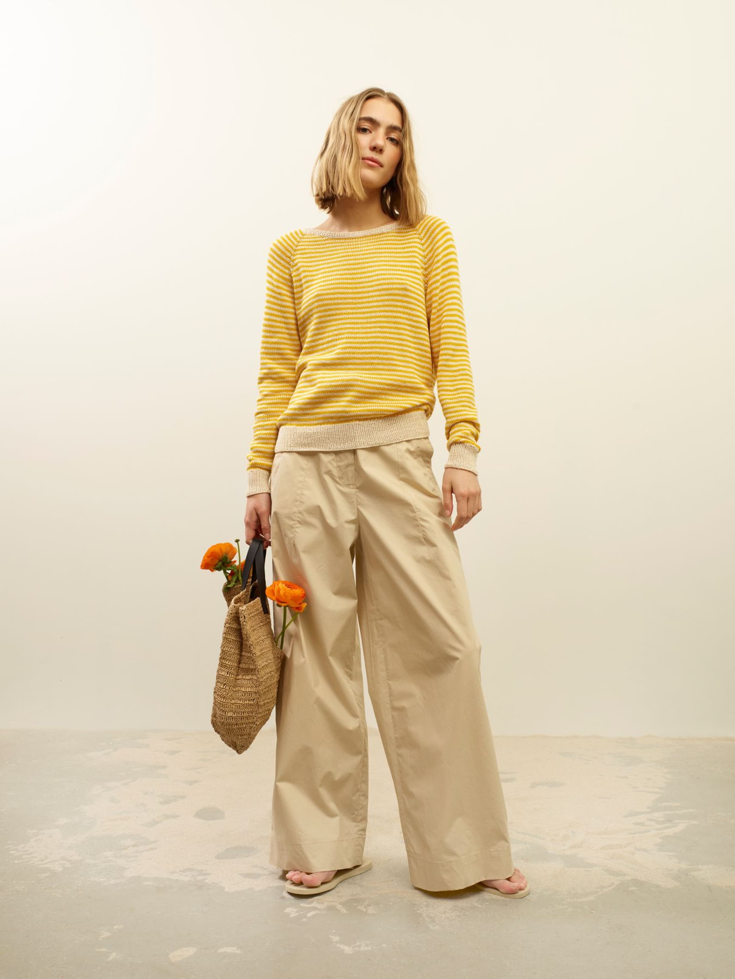 Flora stripegenser er en enkel glattstrikket genser med smale striper, rund hals og klassisk passform. Genseren strikkes ovenfra og ned med raglanøkninger og ribbestrikkede kanter. Først strikkes halskanten, og videre strikkes bærestykket. Halsringningen formes ved å strikke vendepinner og det økes samtidig til raglan. Etter raglanøkningene deles arbeidet inn i ermer og bol, og hver del strikkes videre hver for seg nedover og avsluttes med ribbekanter. For å få en klassisk passform, strikk en størrelse som er 6-12 cm større enn brystvidden din.