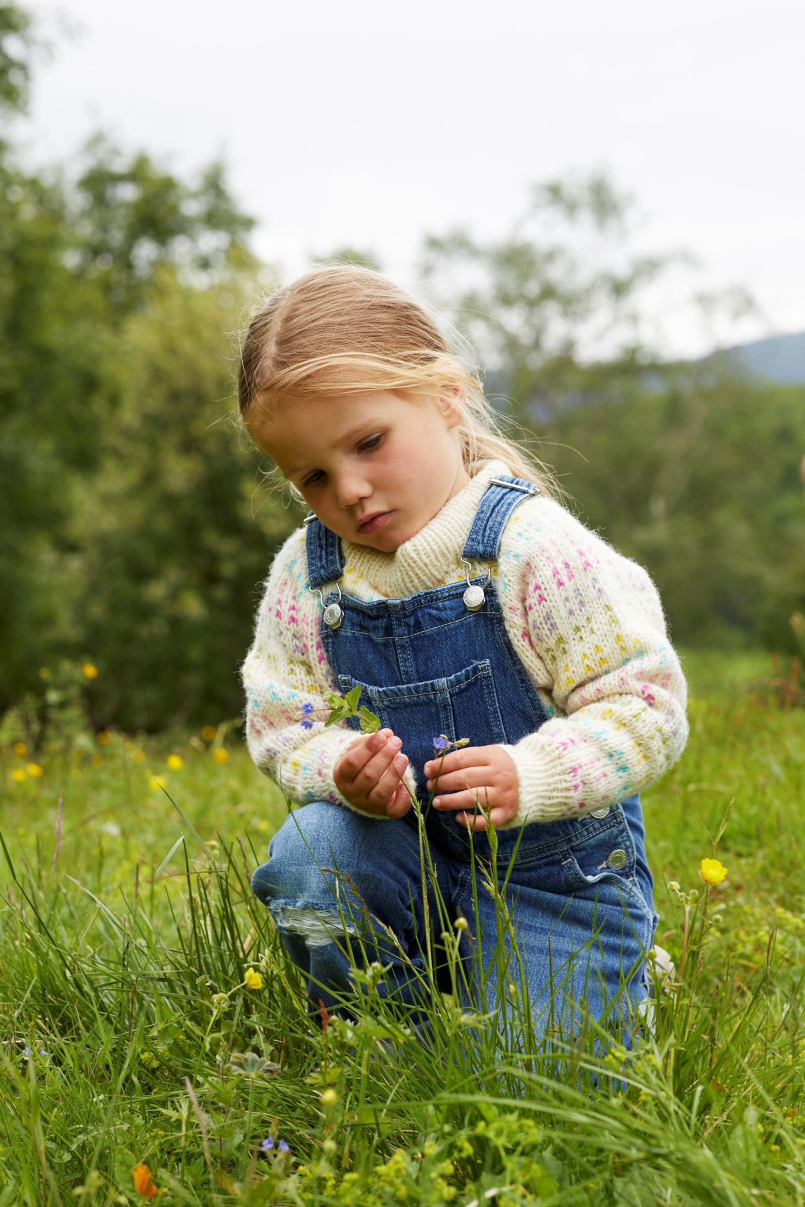 Ytterbakkegenser til barn er en helmønstret genser strikket i én bunnfarge og seks mønsterfarger. Mønsteret er en vri på det tradisjonelle lus-mønsteret i en morsom fargesetting. Genseren har en kort, rett og avslappet fasong med rund hals. Genseren er strikket ovenfra og ned. Først strikkes en halskant som skal brettes dobbel. Ringningen formes ved å strikke vendepinner, samtidig som det økes til raglan. Mellom raglanøkingene strikkes det en liten mønsterbord. Etter raglanøkingene deles arbeidet, og bol og ermer strikkes hver for seg. For en avslappet passform, velg en størrelse som er 10-16 cm større enn barnets brystvidde.