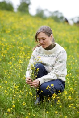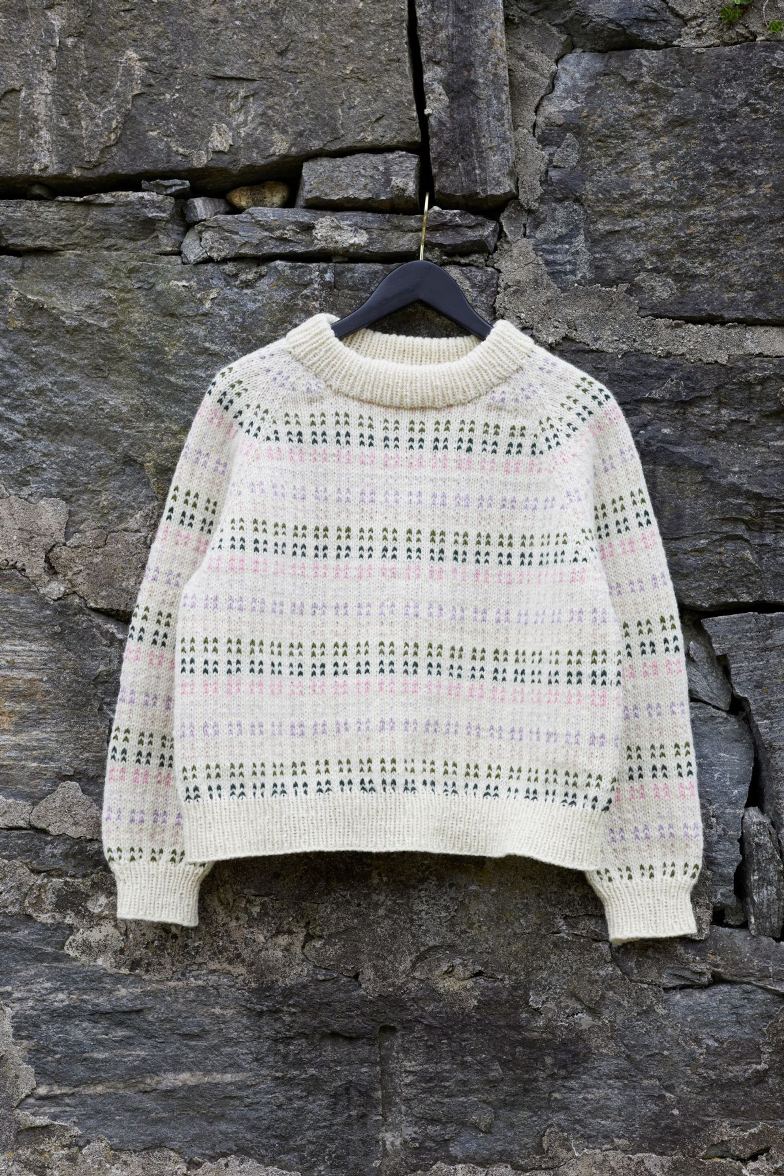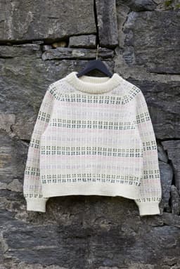 Strikket ovenfra og ned Ytterbakkegenser til dame er en helmønstret genser strikket i én bunnfarge og seks mønsterfarger. Mønsteret er en vri på det tradisjonelle lus-mønsteret og i en morsom fargesetting. Genseren har en kort, rett og avslappet fasong med rund hals. Genseren er strikket ovenfra og ned med. Først strikkes en halskant som skal brettes dobbel. Ringningen formes ved hjelp av vendepinner, samtidig som det økes til raglan. Mellom raglanøkingene strikkes det en liten mønsterbord. Etter raglanøkingene deles arbeidet, og bol og ermer strikkes hver for seg. For en avslappet passform, velg en størrelse som er 14-26 cm større enn din egen brystvidde.