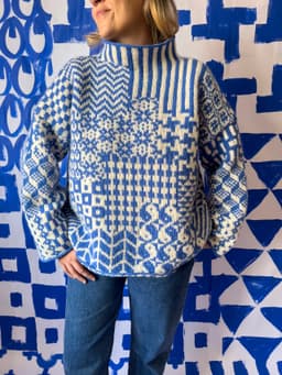 Boxy sweater med patchwork av tradisjonelle nordiske mønstre. Til Fremstrikk har Laura Dalgaard designet Nordic Mix Sweater. En mønstret genser i to farger inspirert av tradisjonsstrikk fra de nordiske landene. «Jeg er først og fremst inspirert av garnet, altså Fivel. Jeg fikk lyst til å lage en mash-up av ulike tradisjonsmønster og gi det nytt liv.» Laura fant gamle bilder av gensere i mønsterstrikk som hun klippet fra hverandre og limte sammen igjen til en genser med ulike mønster. Denne oppskriften er på dansk.