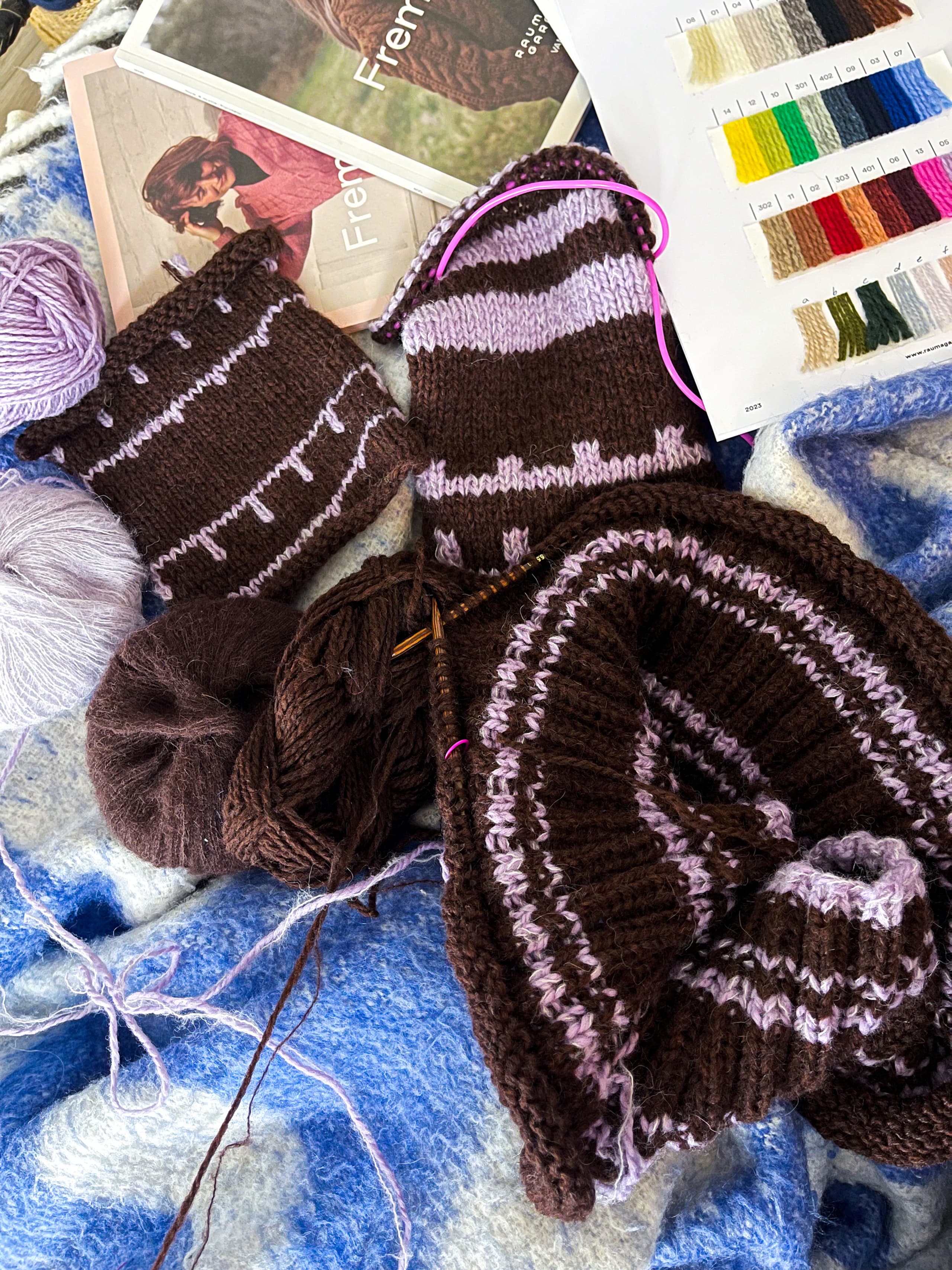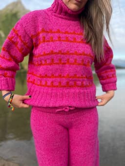 Hele genseren strikkes med 1 tråd Fivel og 1 tråd Alpaca Silk. Genseren strikkes nedenfra og opp. Du starter med ribbkant, før du går over til mønsterstrikk som er gjennomgående for hele genseren. Når bol er strikket ferdig, deler du arbeidet i to deler, forstykke og rygg. Mens du strikker frem og tilbake over disse delene feller du i starten inn mot ermene, dette for at genseren skal sitte godt til kroppen, og ikke klumpe seg under ermene. Da Stine Erikstad skulle designe til Fremstrikk så hun for seg en oversized genser med mønster. Hun begynte på en prøvelapp og tenkte ‘Shit, I got it!’, men det gikk lang tid før hun plukket opp prøvelappen igjen. Det er gjerne et tegn på at noe skurrer. Hun gikk flere runder. Og så løsnet det. Det ble enkel mønsterstrikk med grafiske søyler i to farger, og to tråder. Fivel og Alpaca Silk. Hun designet også en bukse, og settet har fått navnet Gloria sett. Denne oppskriften er på engelsk.