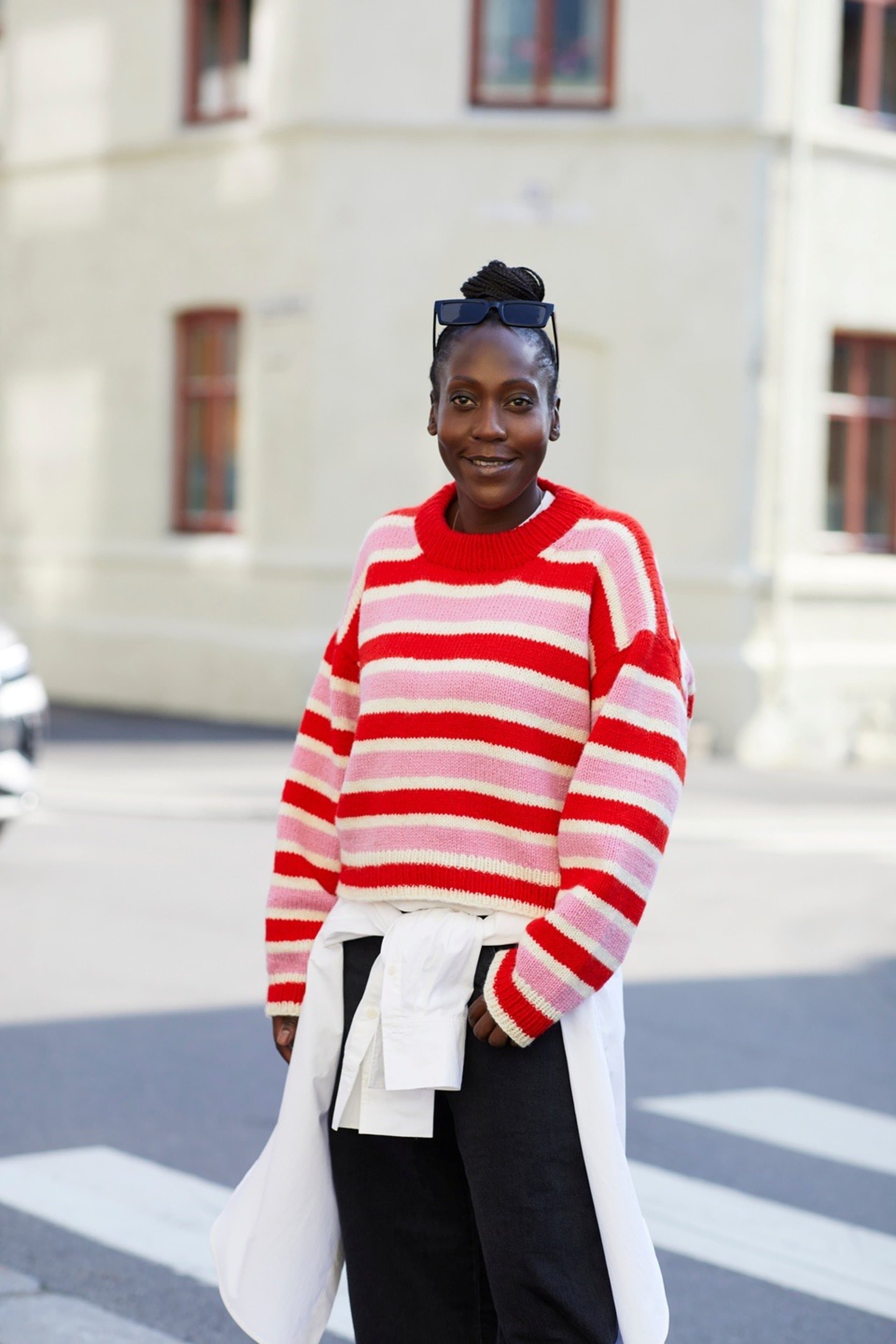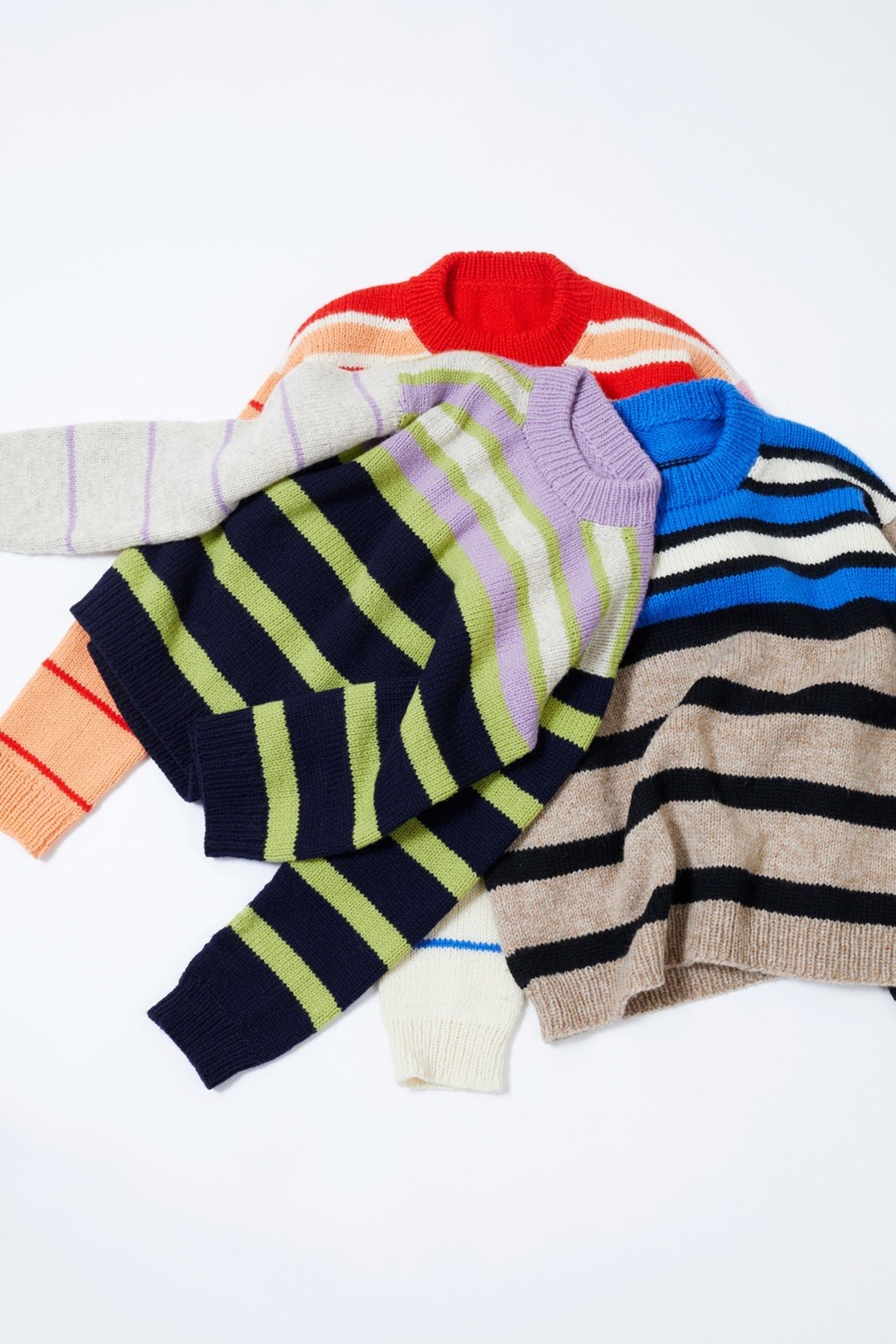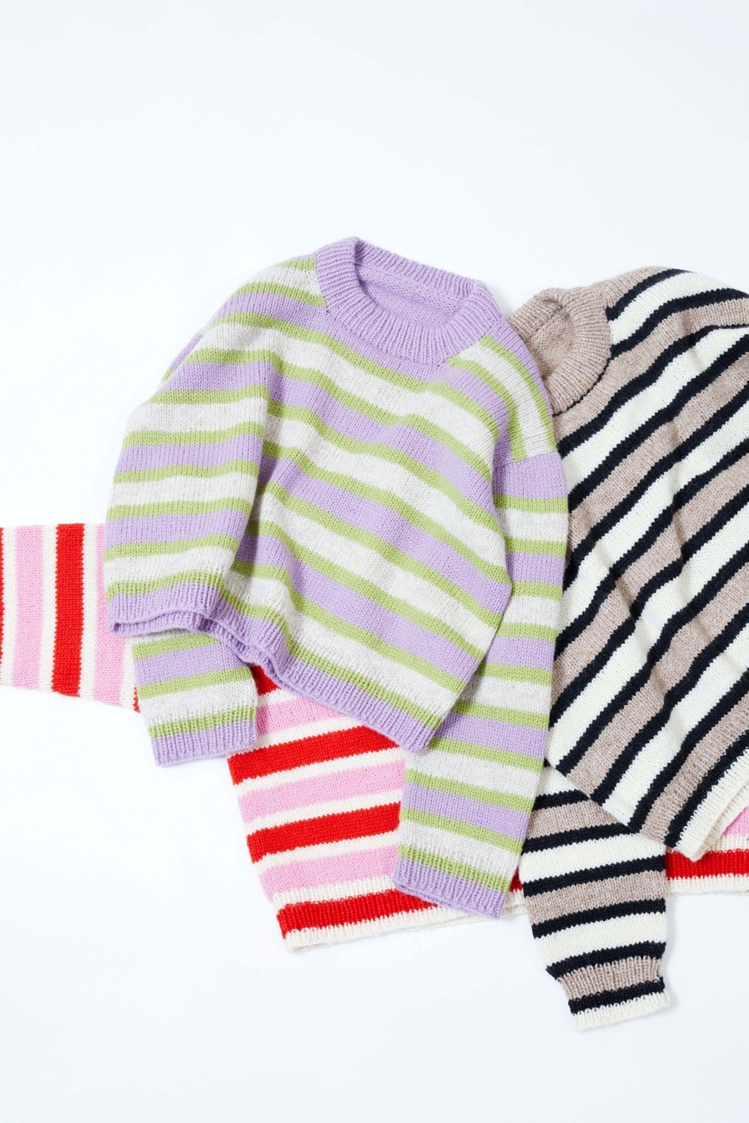 Uni stripegenser er en glattstrikket stripegenser med European shoulder (skrå skuldre bak), som strikkes ovenfra og ned. Den har en ledig passform, rund hals og kanter i 1x1 ribb. Uni stripegenser kan strikkes i forskjellige stripemønster. Velg mellom stripemønster A, B, C eller ABC som er en kombinasjon av alle tre. Du får tilgang til alle kombinasjonene og oppskriftene i denne oppskriften.