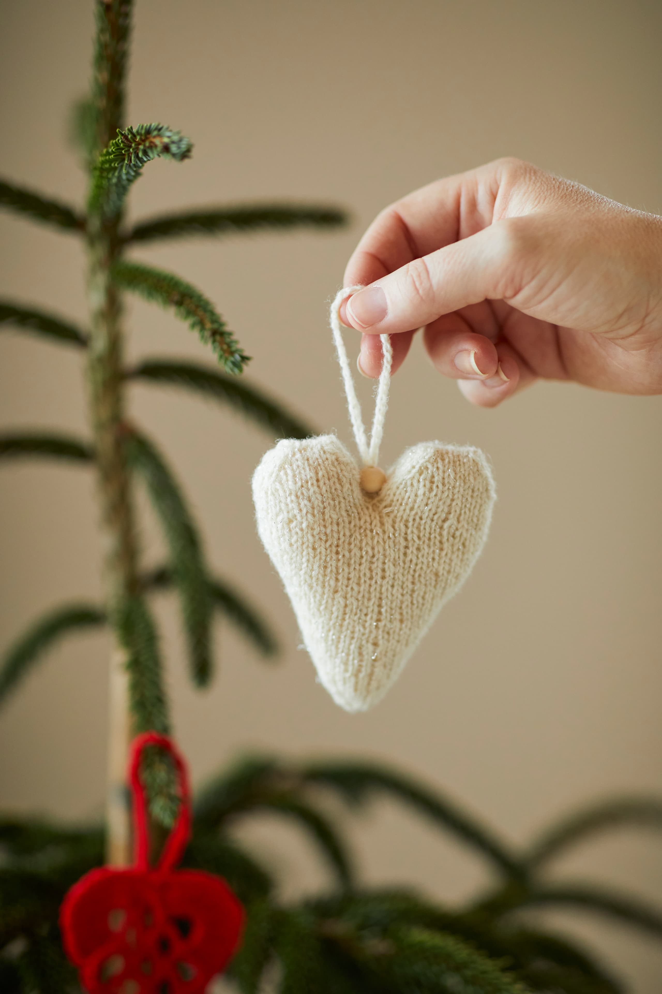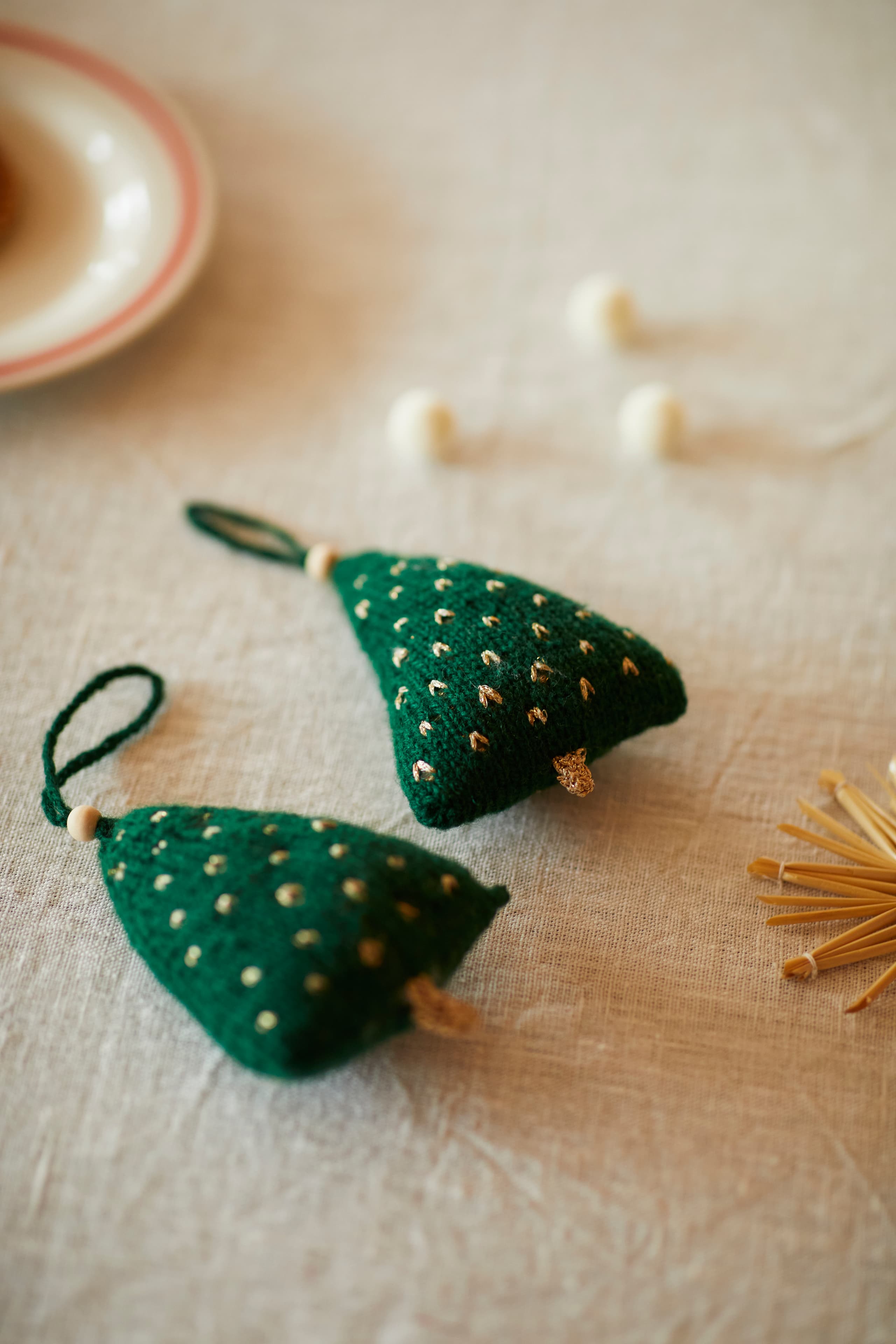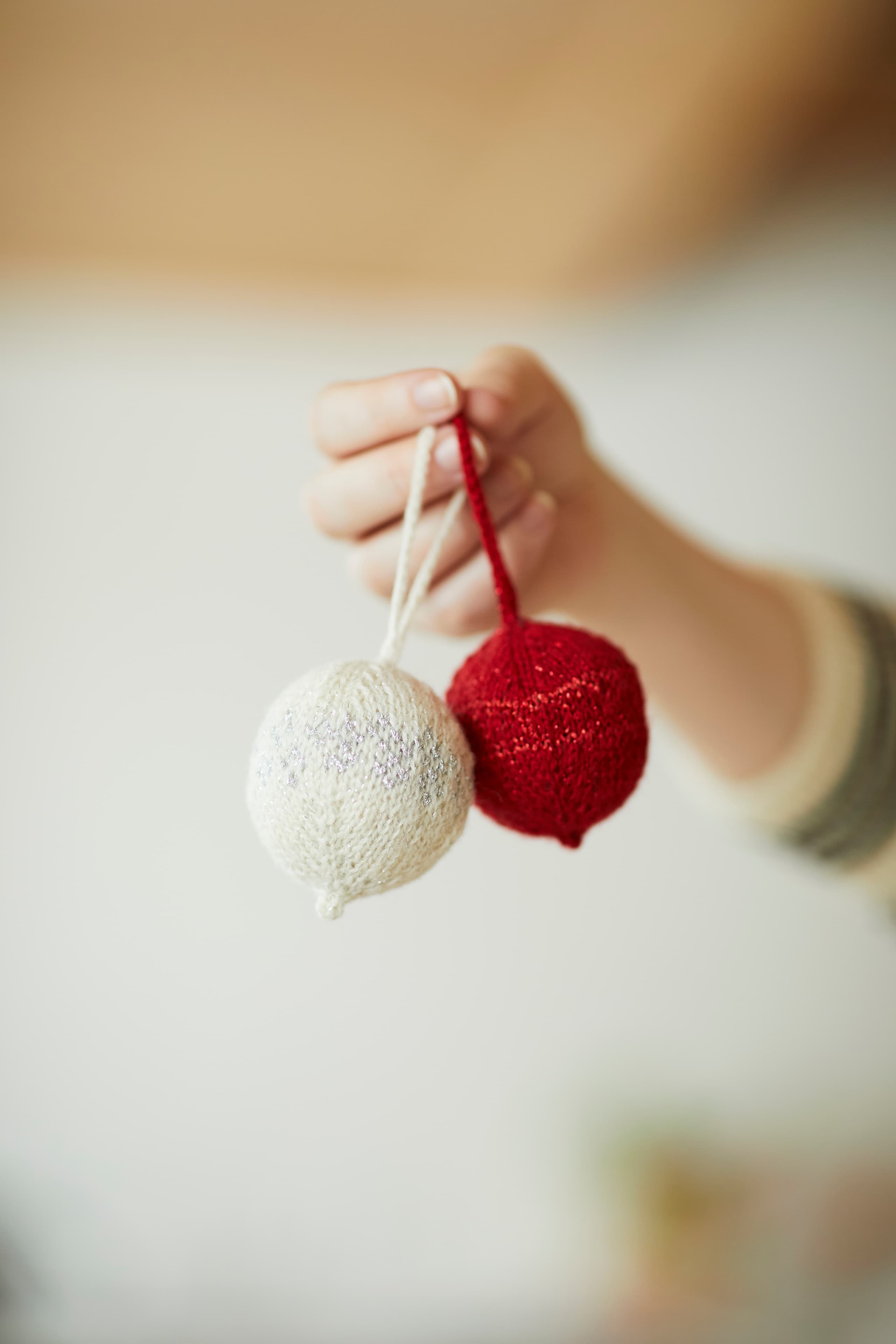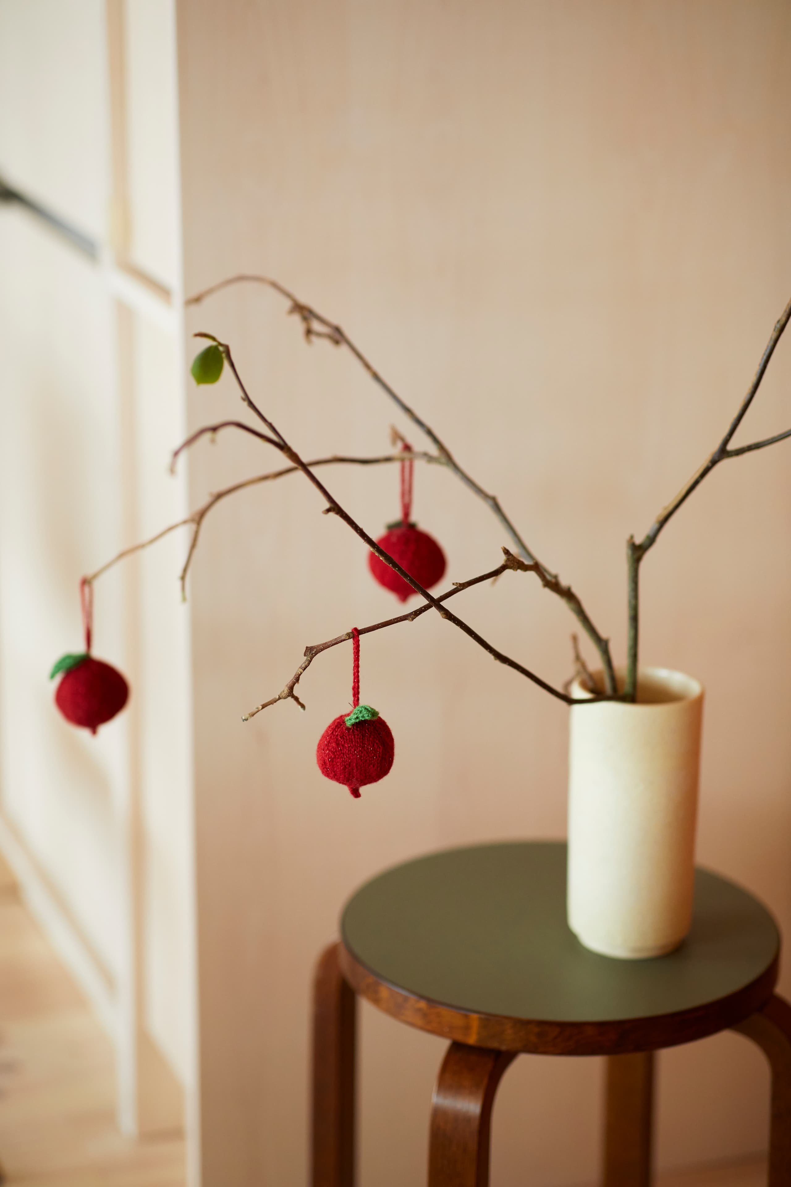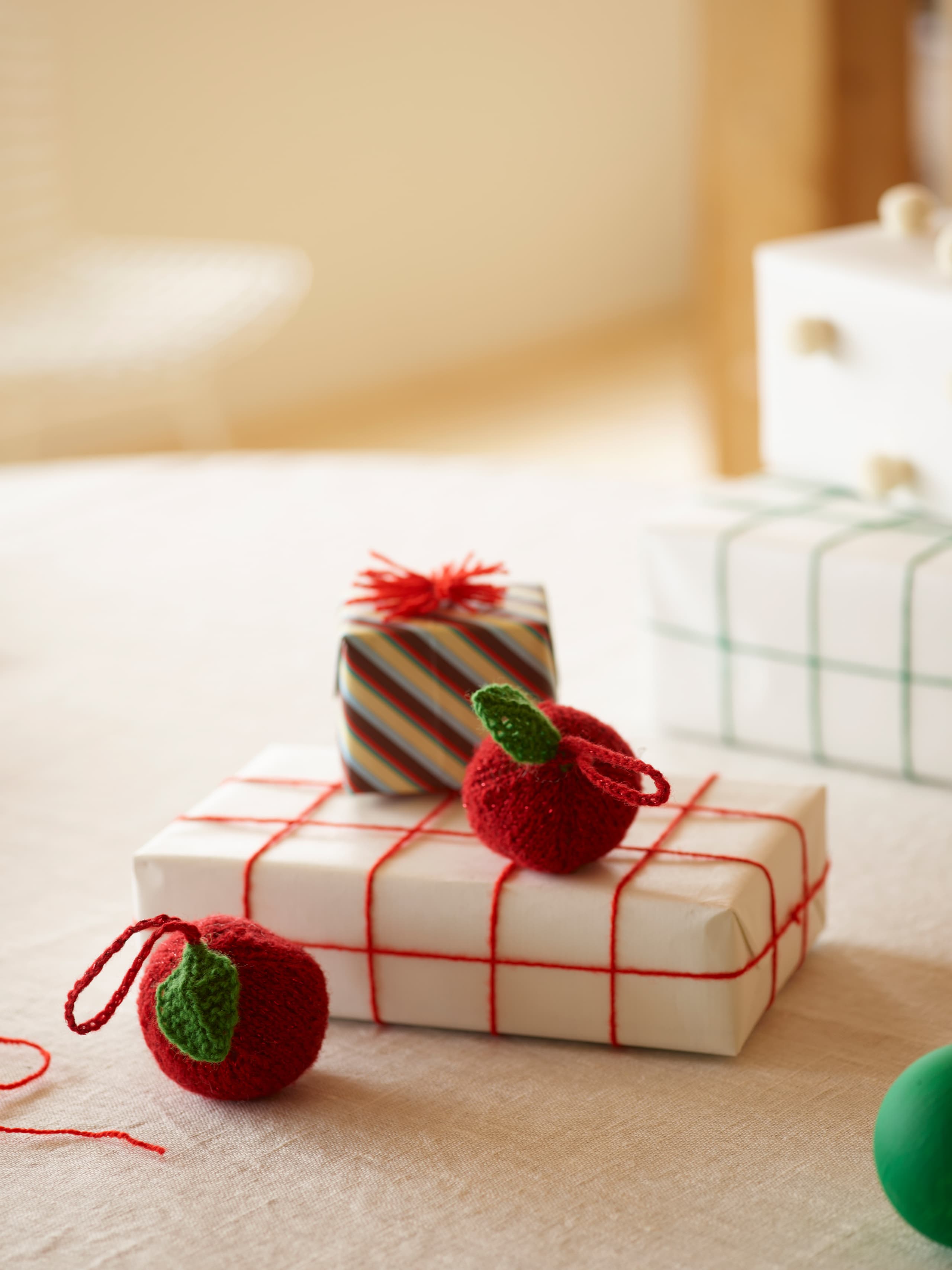 Eplene er glattstrikket og strikkes fra bunnen og opp med en tråd av hver av Lamull og Metallic sammen. Det fylles med ullflor før de siste m snurpes sammen i toppen. I toppen hekles en hempe av luftmasker. Blader strikkes til slutt av Finull, og festes øverst på eplet ved hempen.