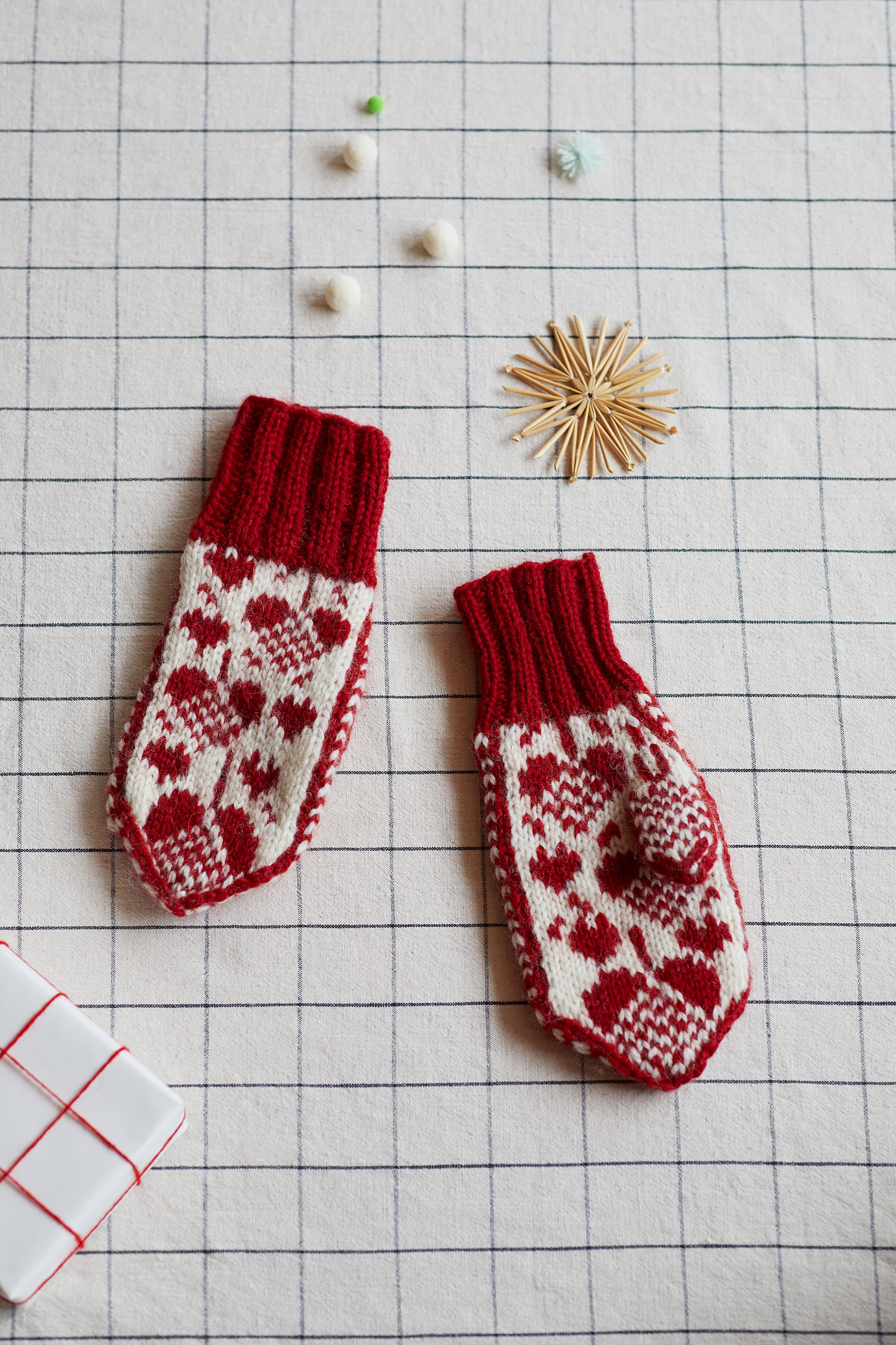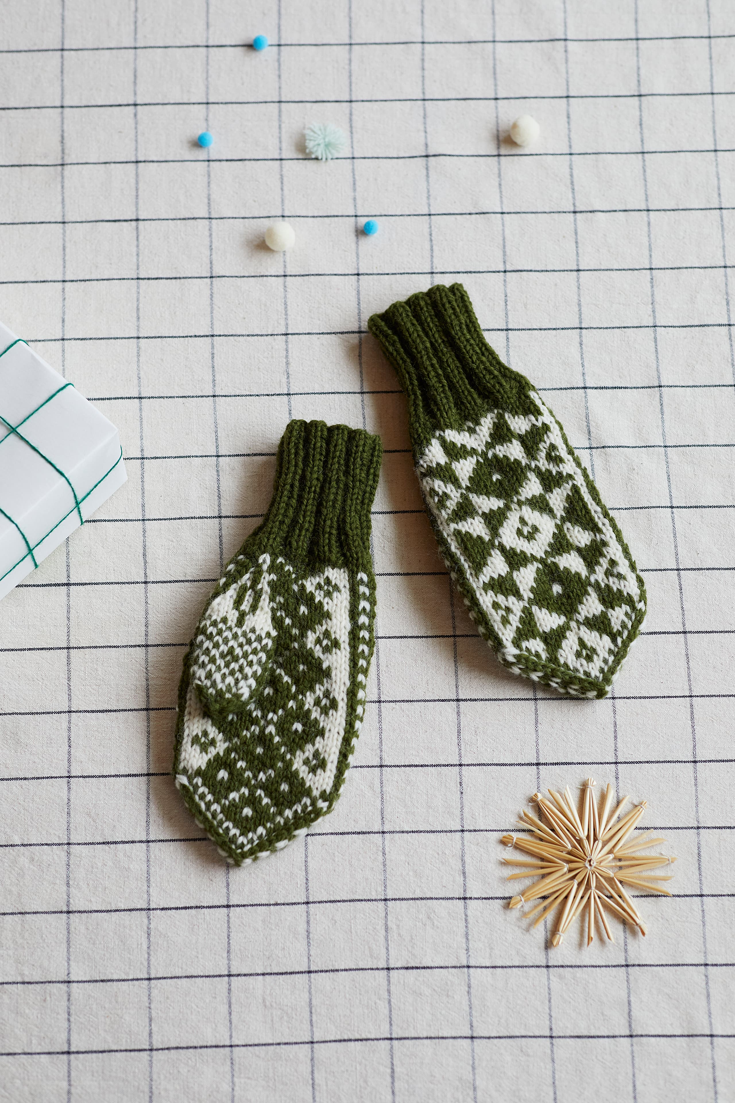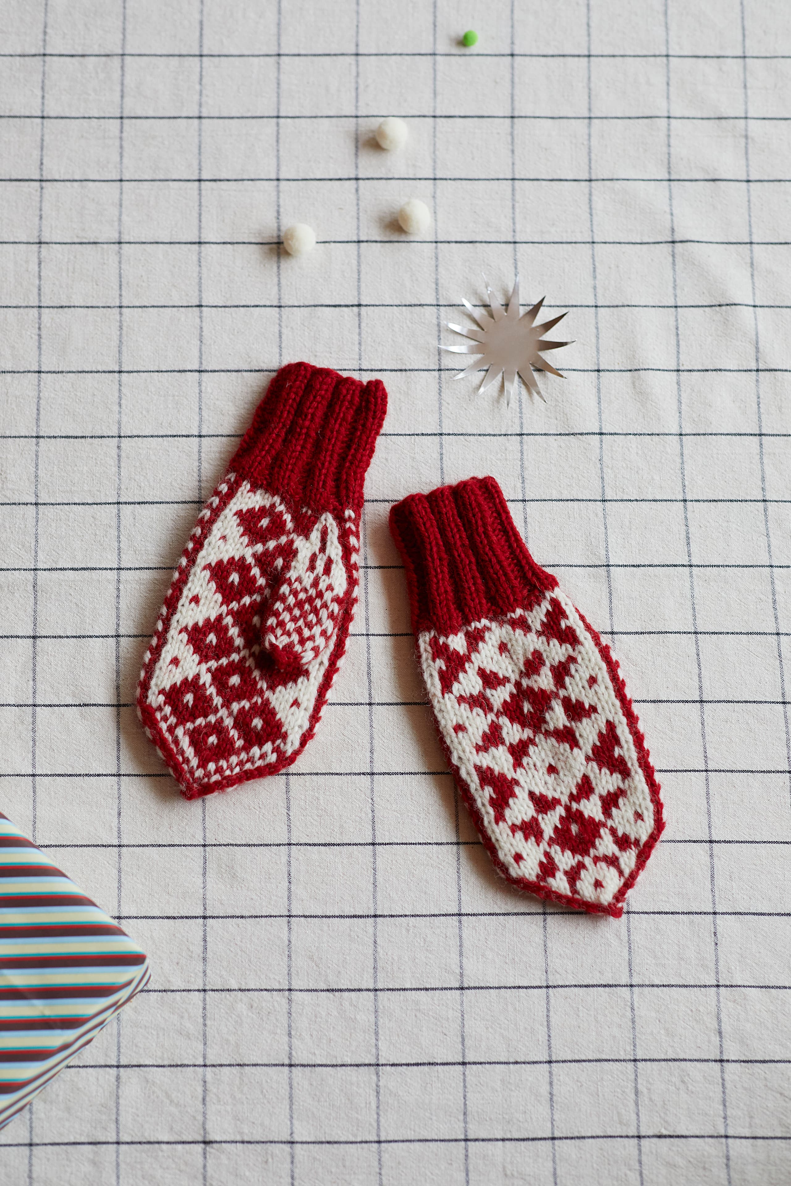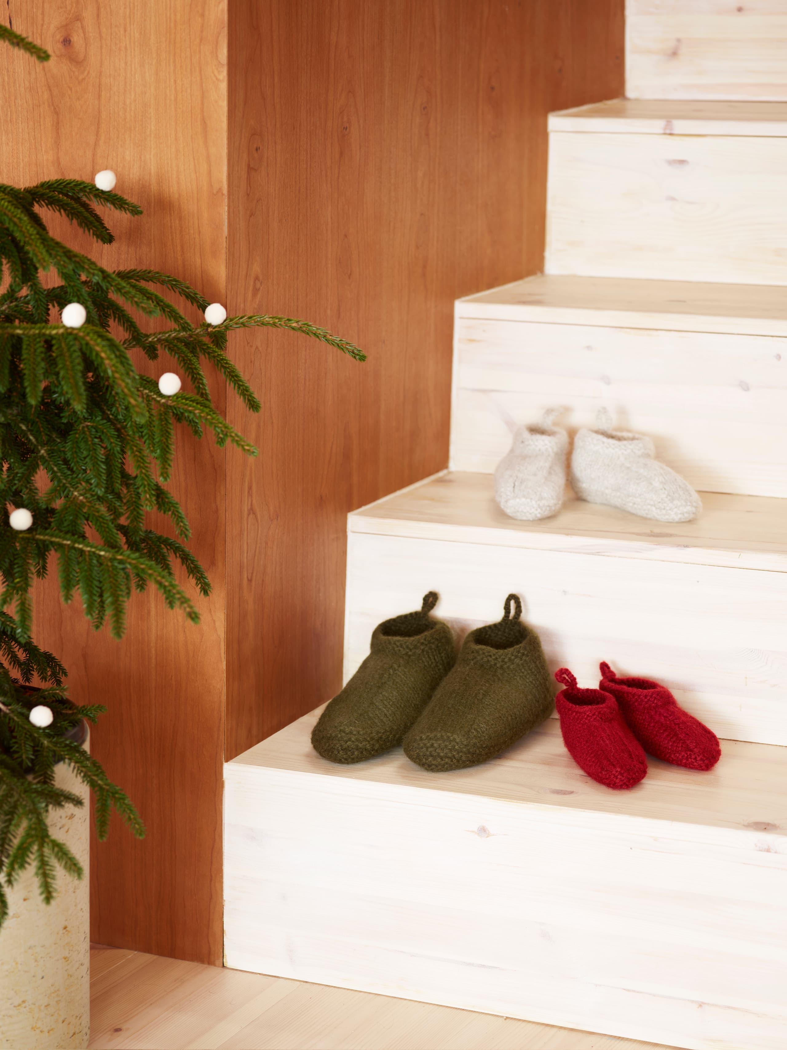 Eplene er glattstrikket og strikkes fra bunnen og opp med en tråd av hver av Lamull og Metallic sammen. Det fylles med ullflor før de siste m snurpes sammen i toppen. I toppen hekles en hempe av luftmasker. Blader strikkes til slutt av Finull, og festes øverst på eplet ved hempen.