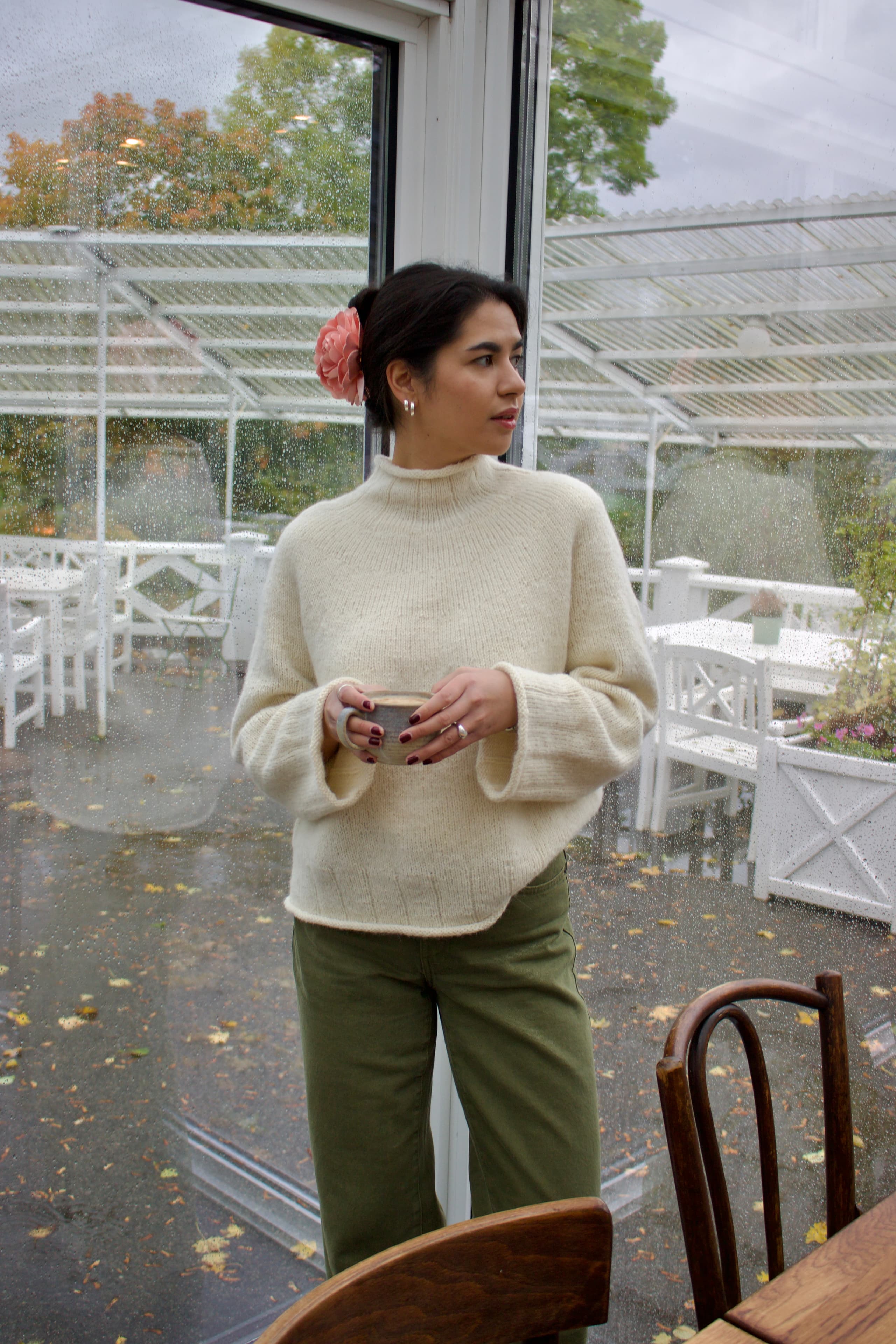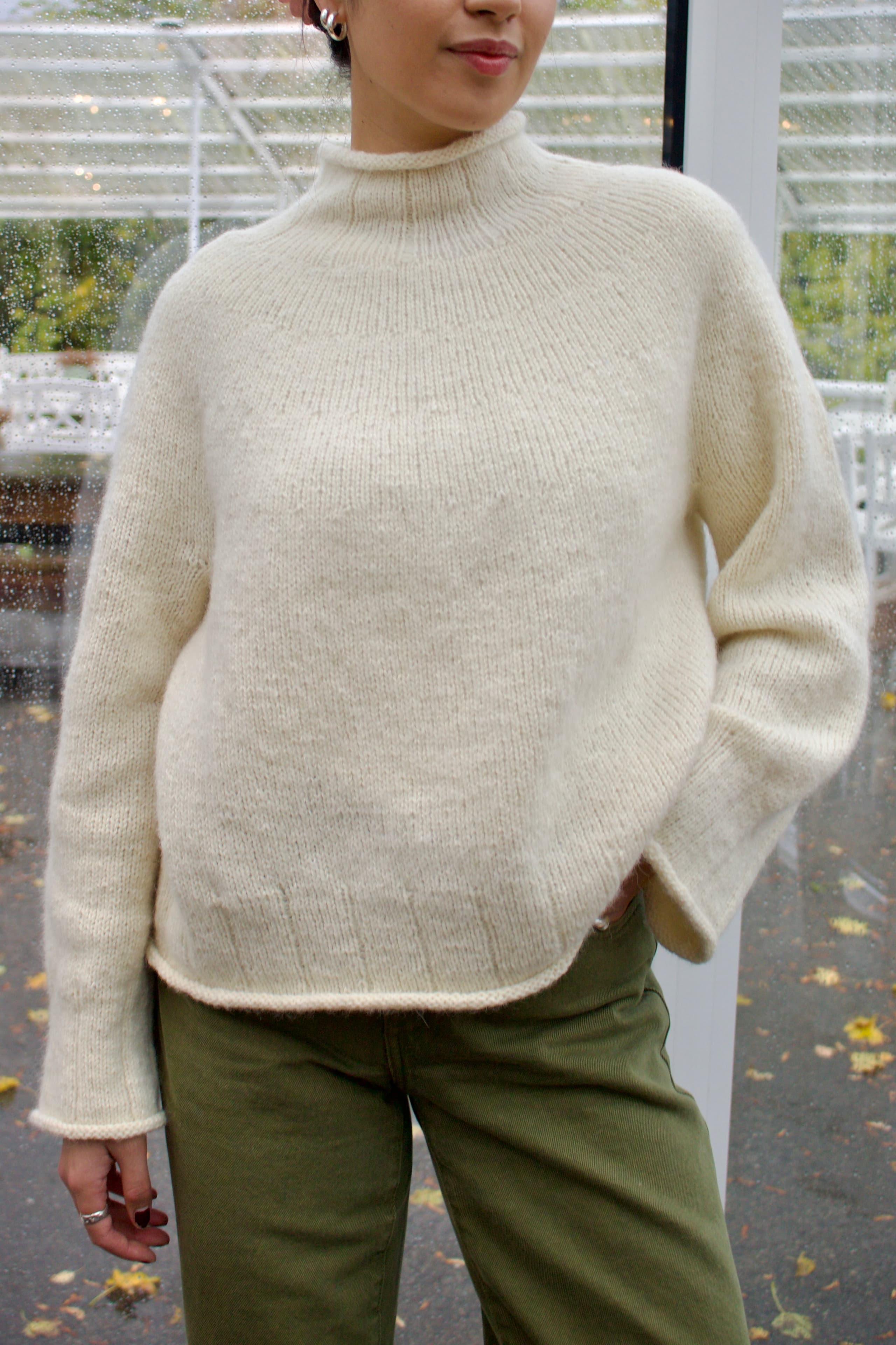Heia rundgenser er en nybegynnervennlig genser med rundt bærestykke, som strikkes i norsk ull. Den har en rett og litt kort fasong med vide ermer og er fri for montering. Genseren strikkes ovenfra og ned, og passer perfekt som første genserprosjekt. En moderne og tidløs genser du vil ha glede av i mange år. Merk at oppskriften originalt strikkes i Fivel, Finull + Alpaca SIlk er et garnalternativ som ikke er oppført i oppskriften. Strikker du i Finull + Alpaca Silk skal det strikkes med en tråd av hver kvalitet.