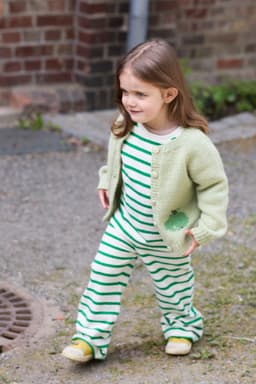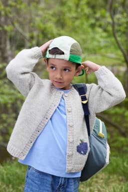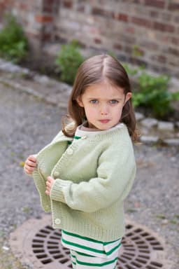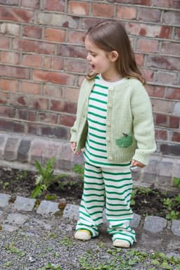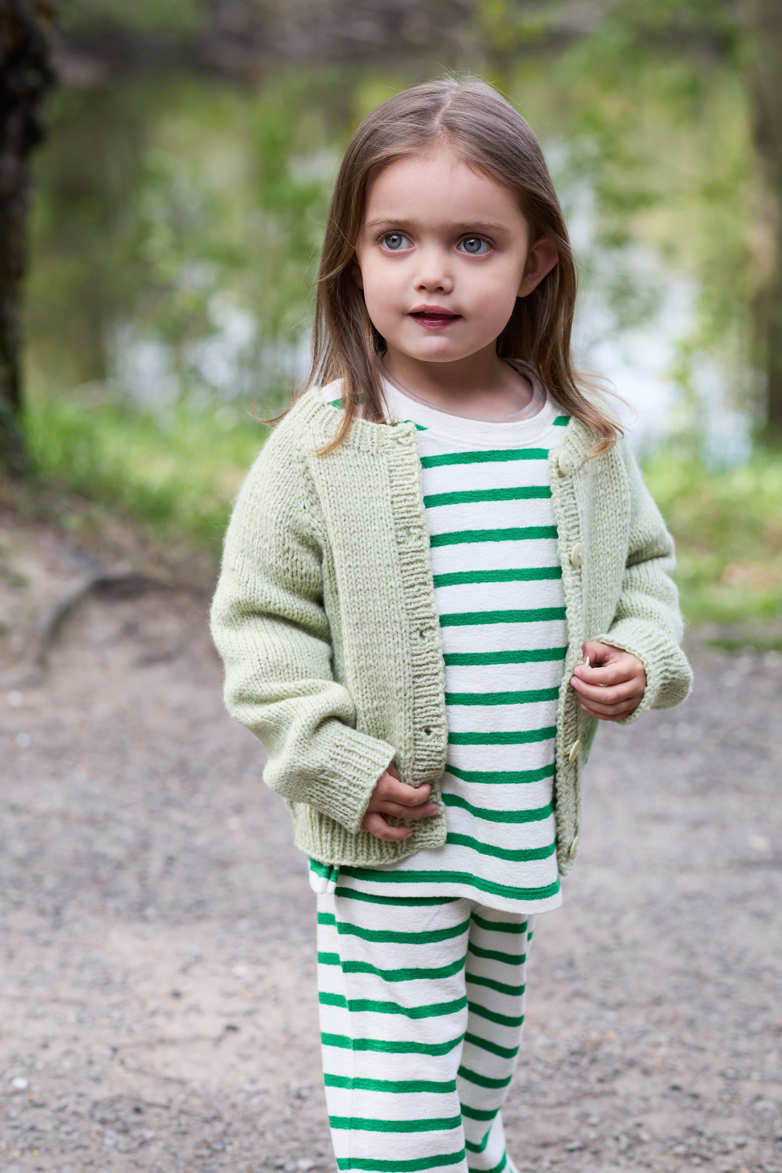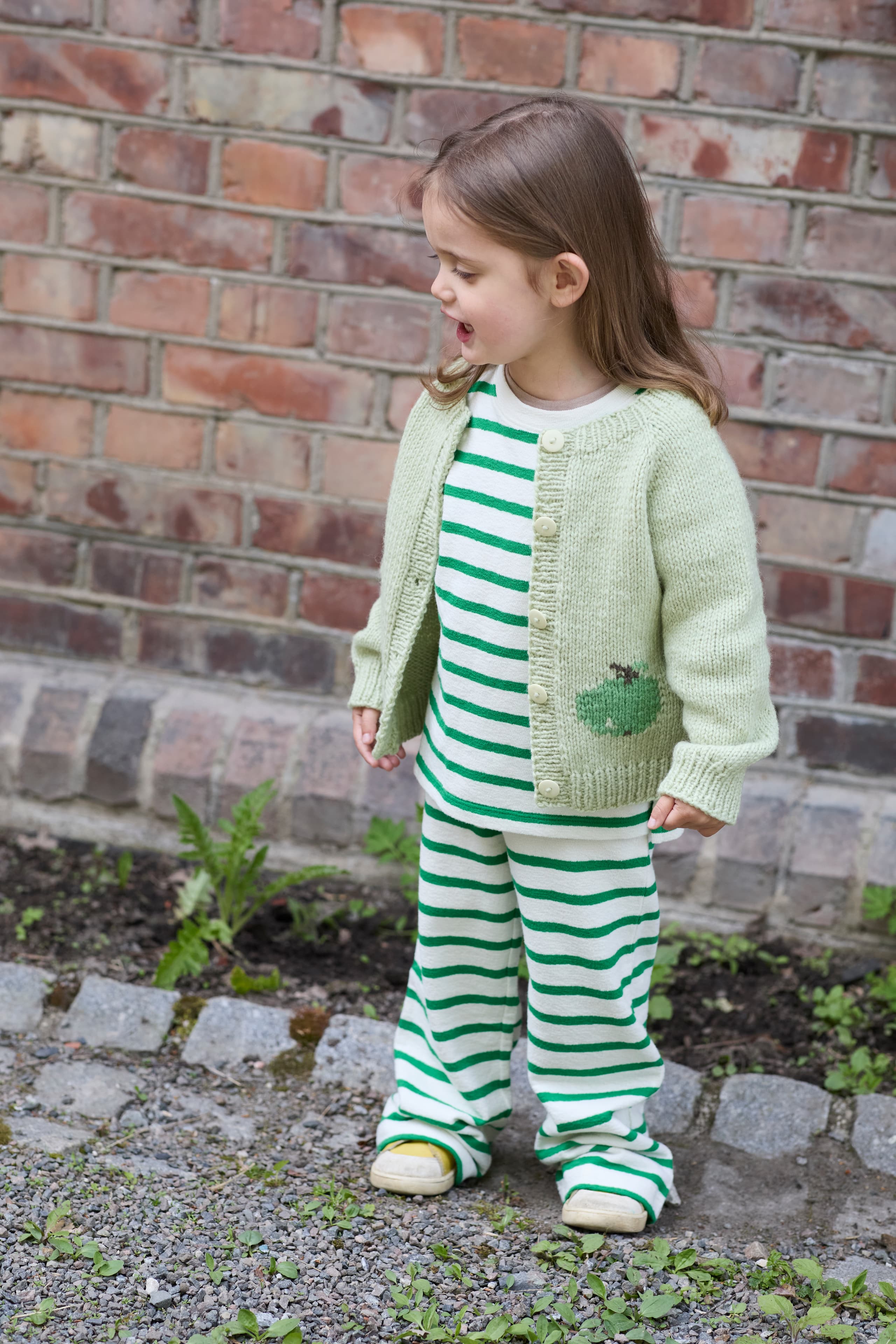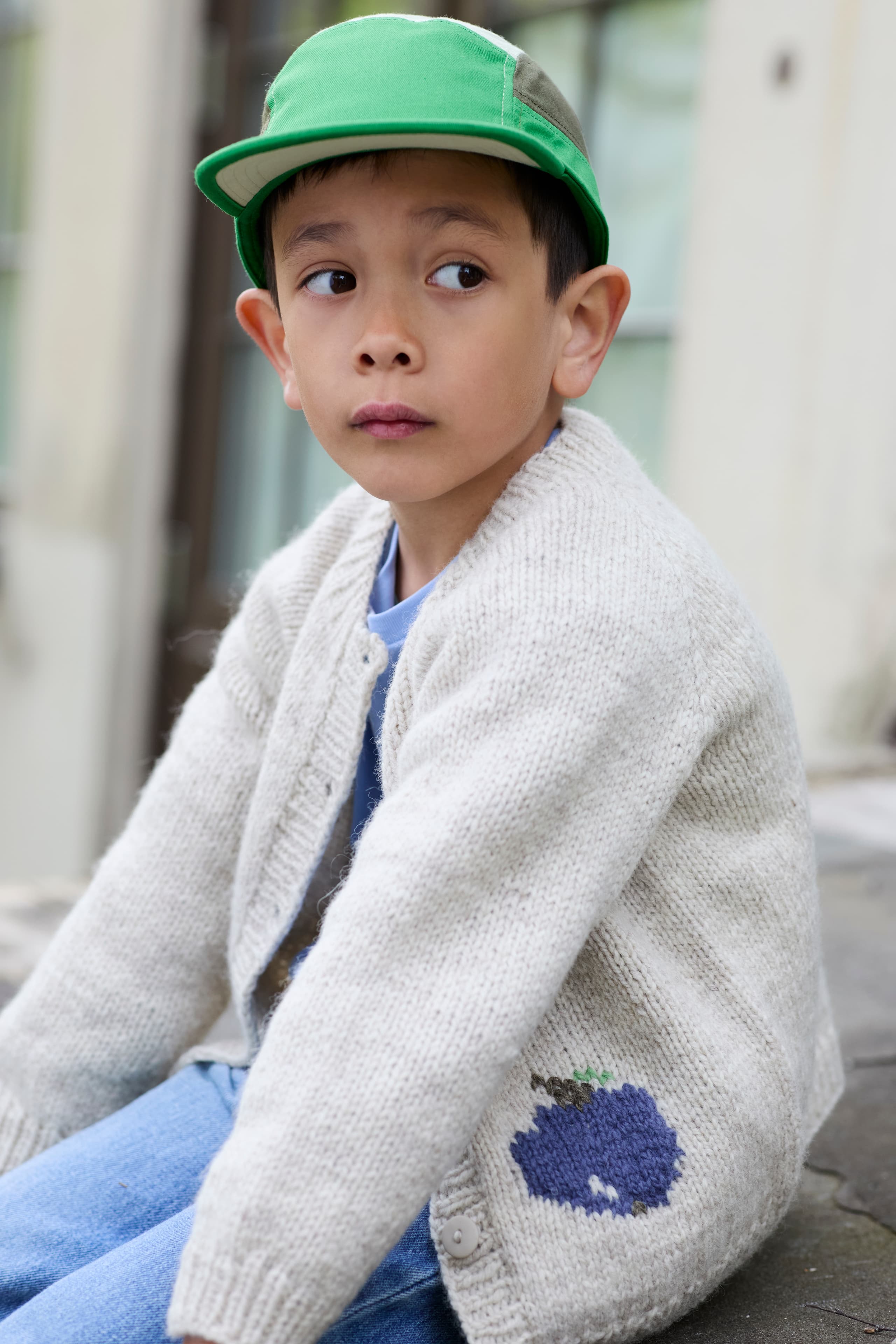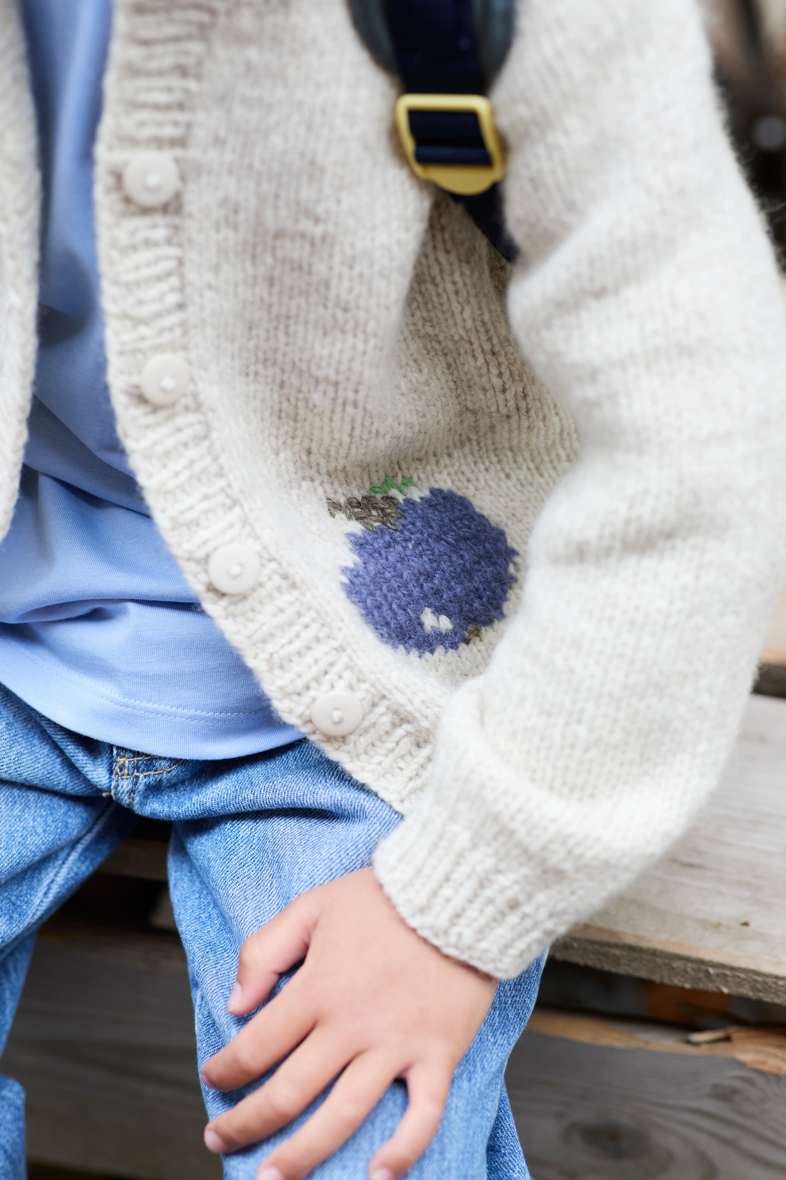 Fruktig jakke er en enkel glattstrikket jakke, med kanter i 1x1 ribb og et søtt eplemotiv strikket i intarsiateknikk. Jakken har en klassisk passform og strikkes frem og tilbake, ovenfra og ned. Arbeidet starter i halsen. Halsutringningen formes ved å strikke vendepinner, samtidig som det økes til raglan på hver side av raglan-maskene. Når raglanøkningene er ferdige, strikkes bolen og ermer hver for seg, og avsluttes med ribb. Til slutt strikkes det opp masker til knappestolpene som strikkes i 1x1 ribb. Det strikkes knapphull på den ene stolpen og sys knapper på den andre.