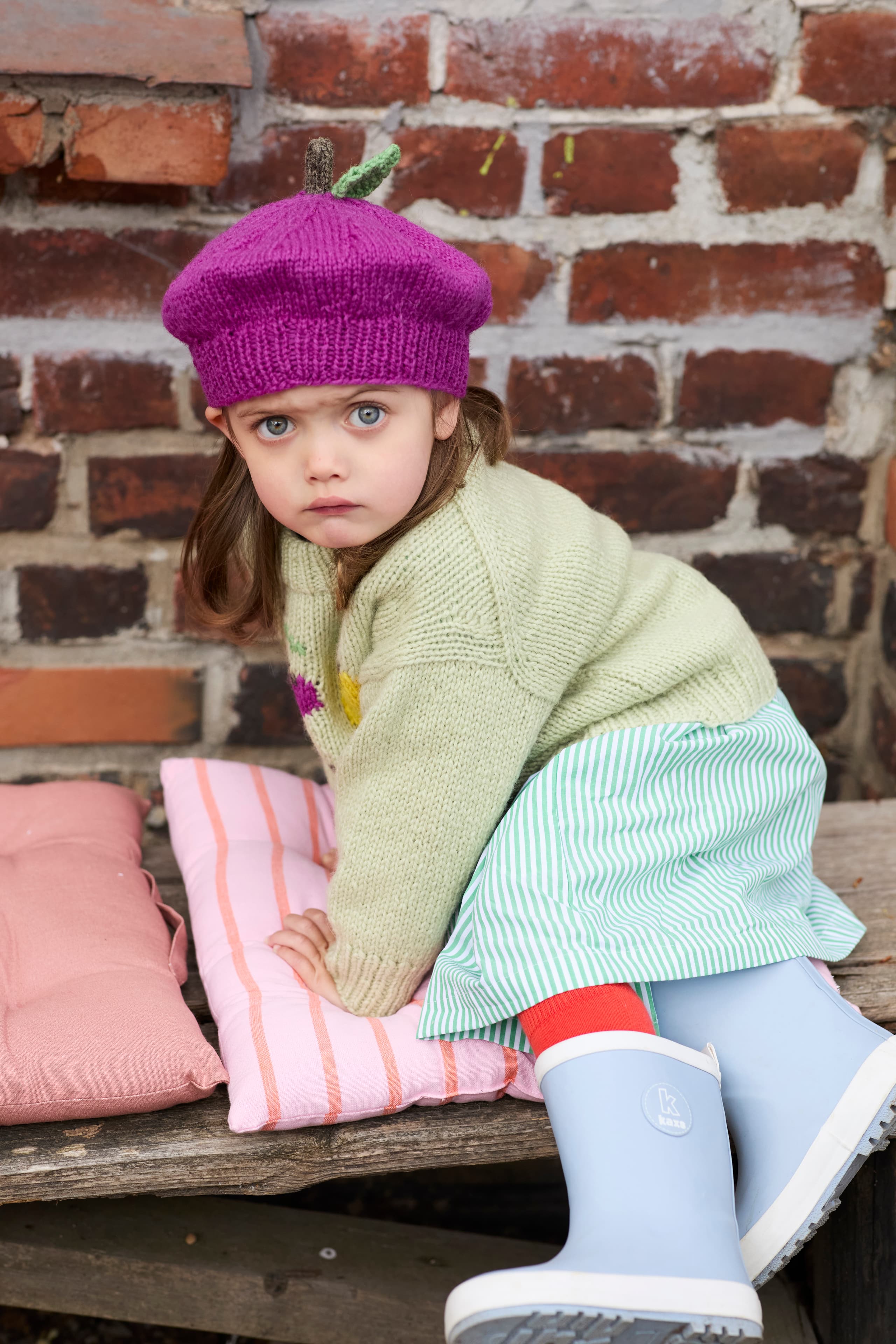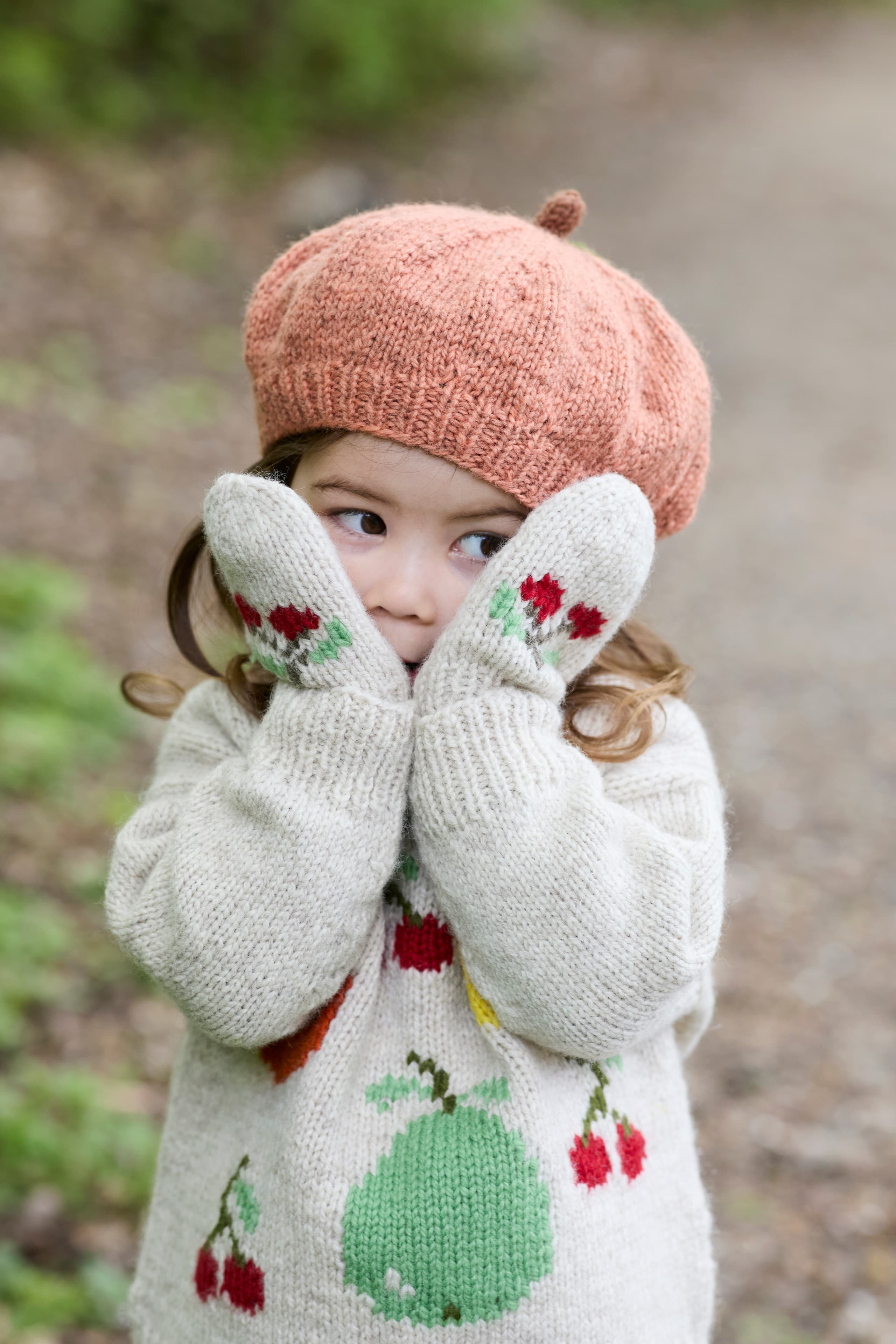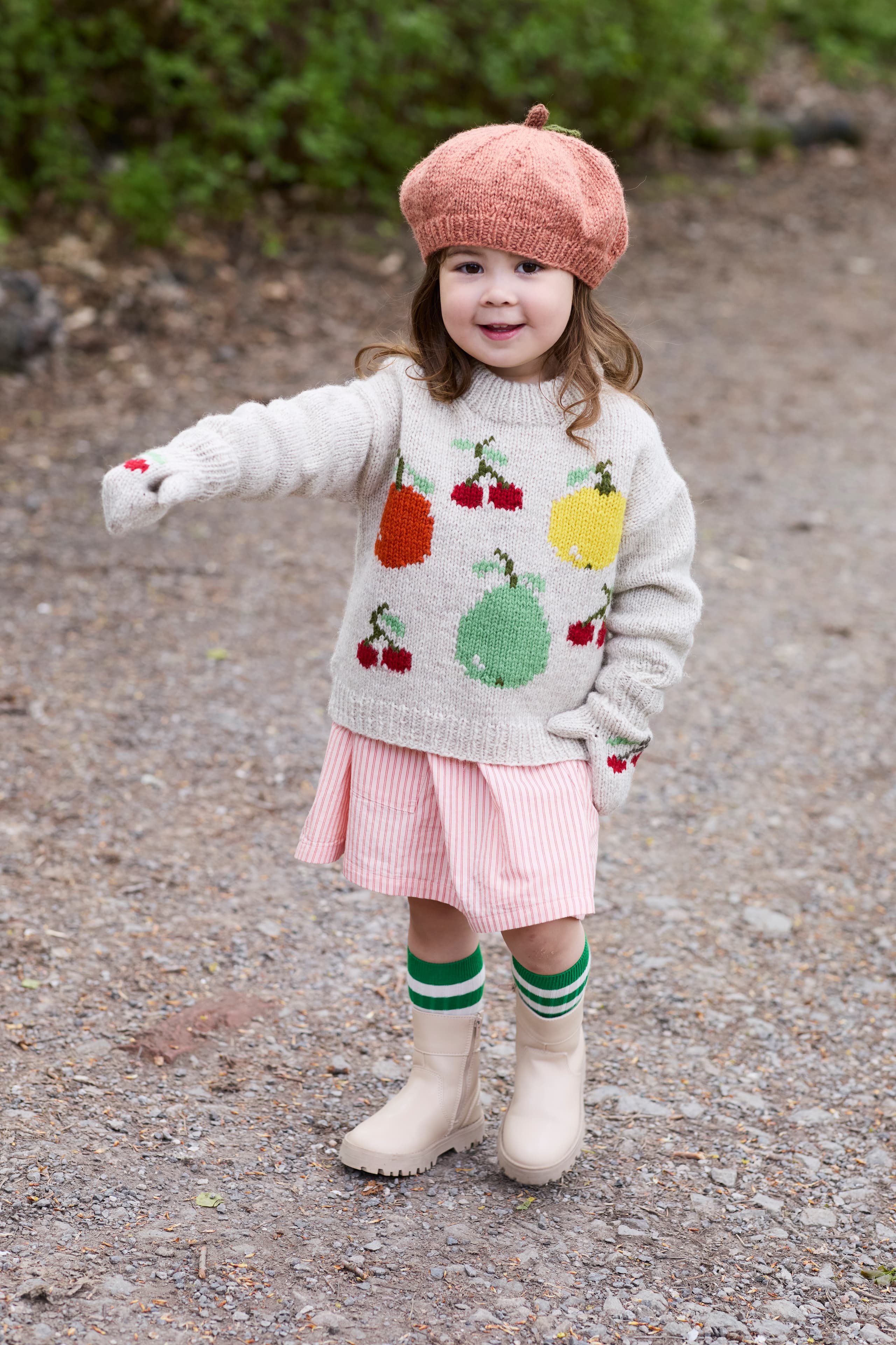 Fruktluen er en morsom og lettstrikket lue som er formet som en frukt! Luen strikkes rundt i glattstrikk, fra hodeåpningen til toppen. Den har en kant i 1x1 ribb rundt hodeåpningen og en «stilk» på toppen med et strikket blad. Luen formes ved først å øke masker jevnt ut og deretter felle masker jevnt inn. Luen avsluttes med en stilk strikket rundt. Til slutt strikkes et blad frem og tilbake, som sys fast ved stilken.