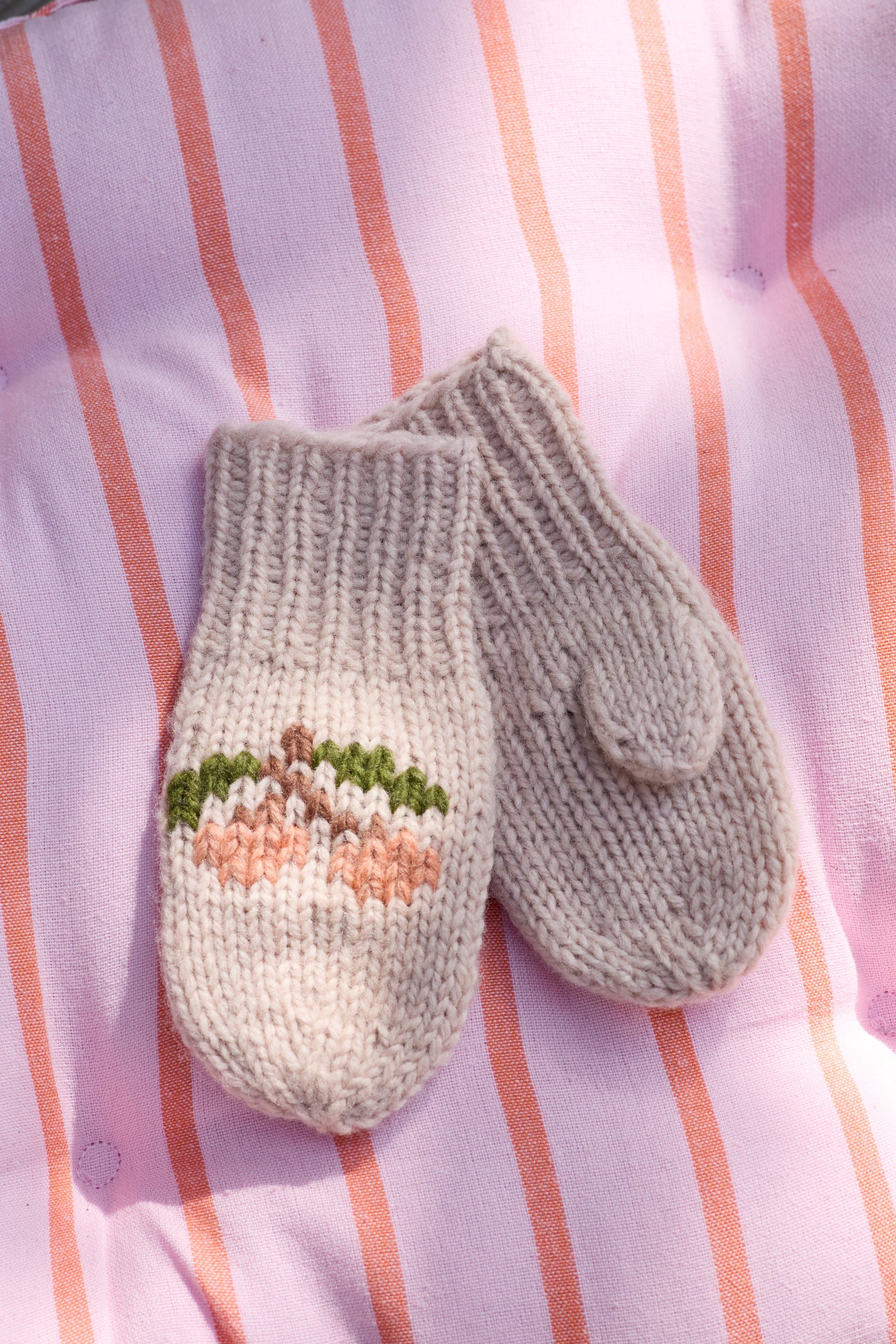Kirsebærvotter er et par enkle votter med søte broderte kirsebær. Vottene strikkes ensfarget fra skaftet og ut til tuppen. Skaftet strikkes i ribbestrikk, mens resten av votten strikkes i glattstrikk. Tommelen lages ved at det felles og legges opp nye masker til et tommelhull.