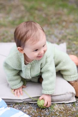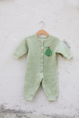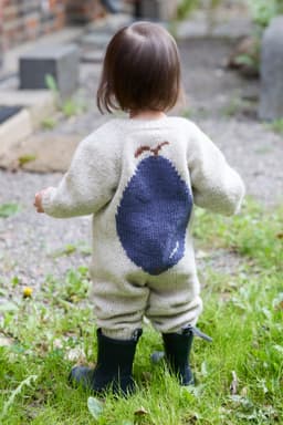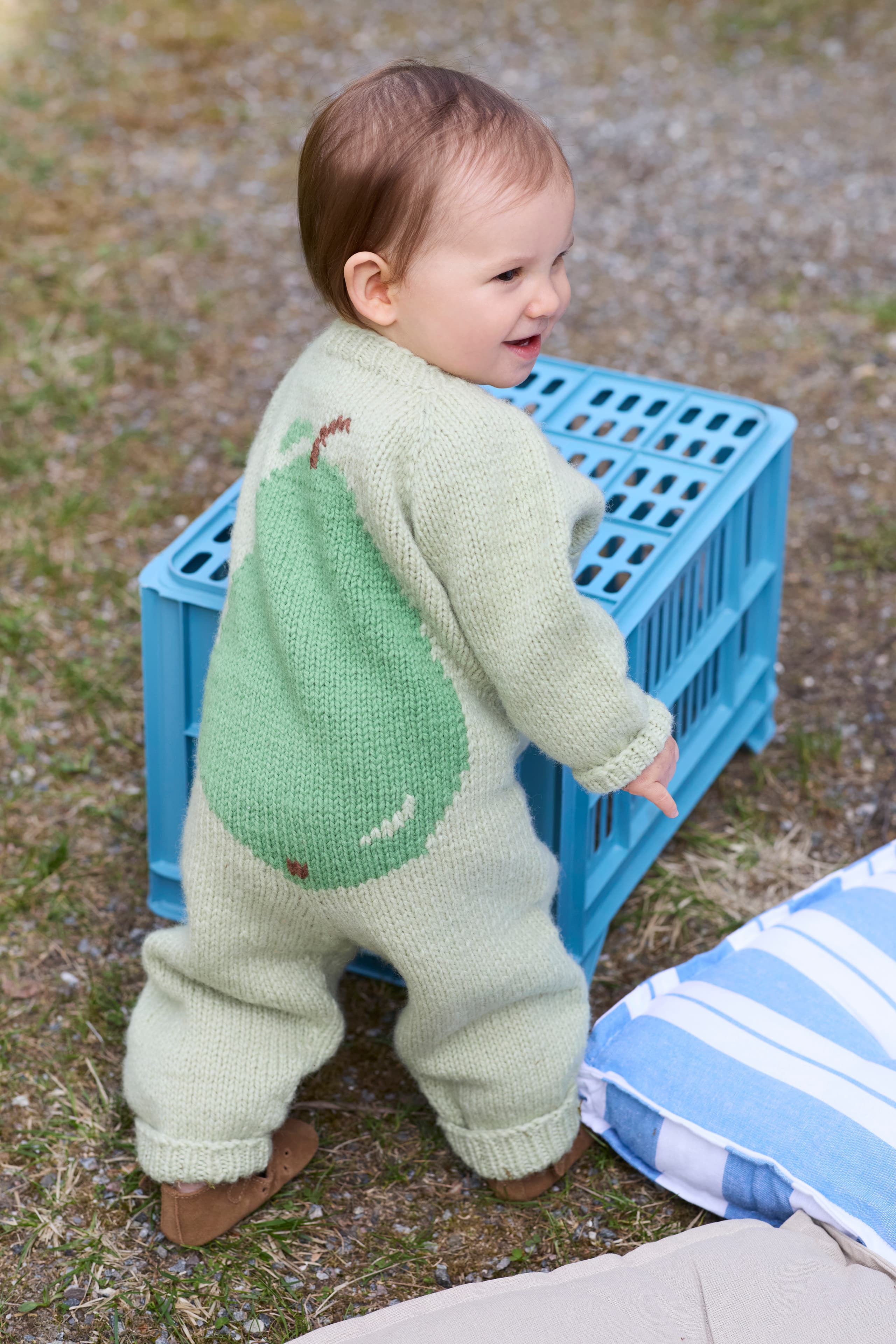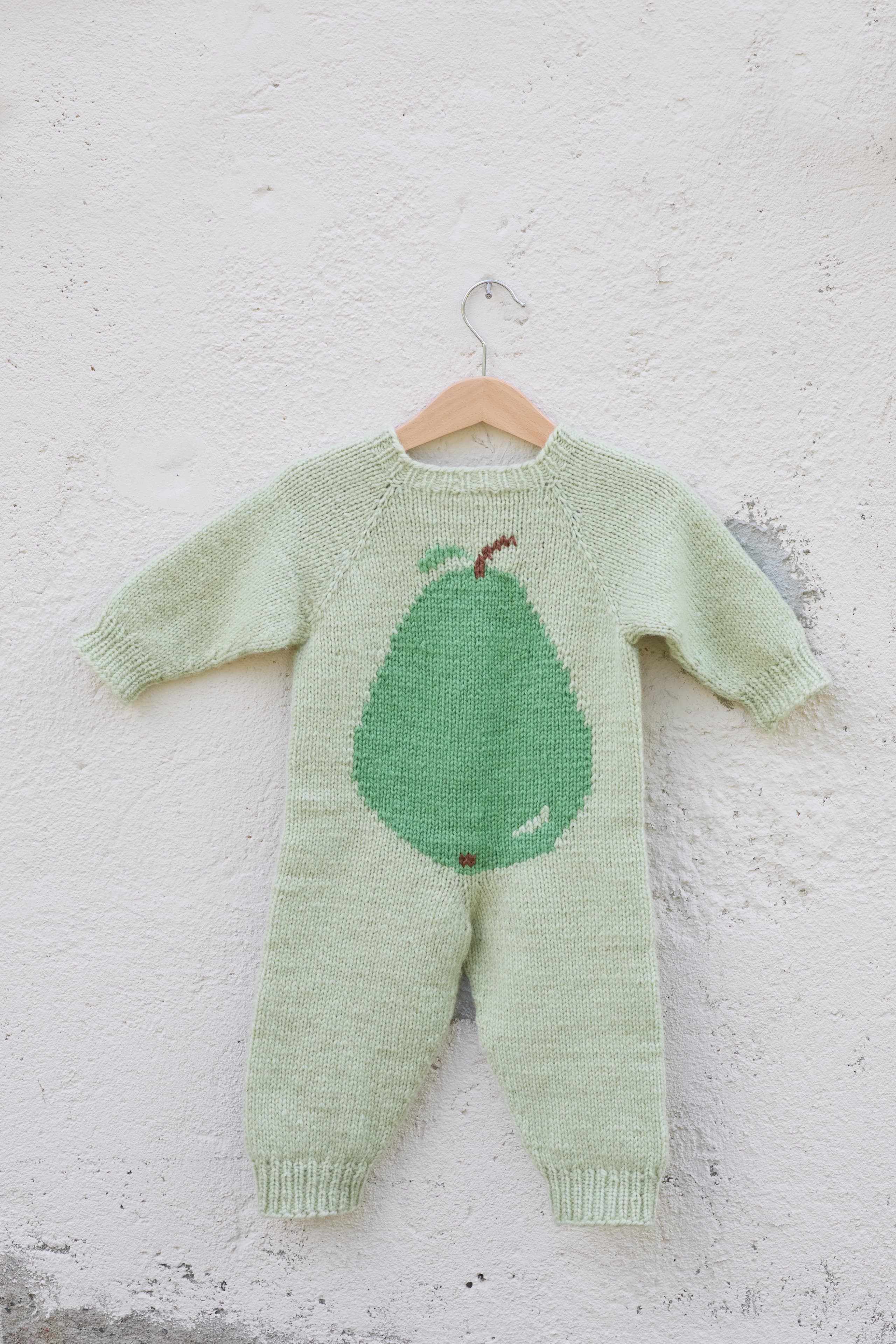 Pæredressen er et herlig hverdagsplagg for små barn med lekne detaljer! Den er glattstrikket med søte pæremotiv i intarsiateknikk og strikkes ovenfra og ned. Den har ei stor pære på ryggen og ei lita pære på venstre forstykket. Dressen har raglanøkninger, rund hals, åpning foran og kanter i 1x1 ribb.
