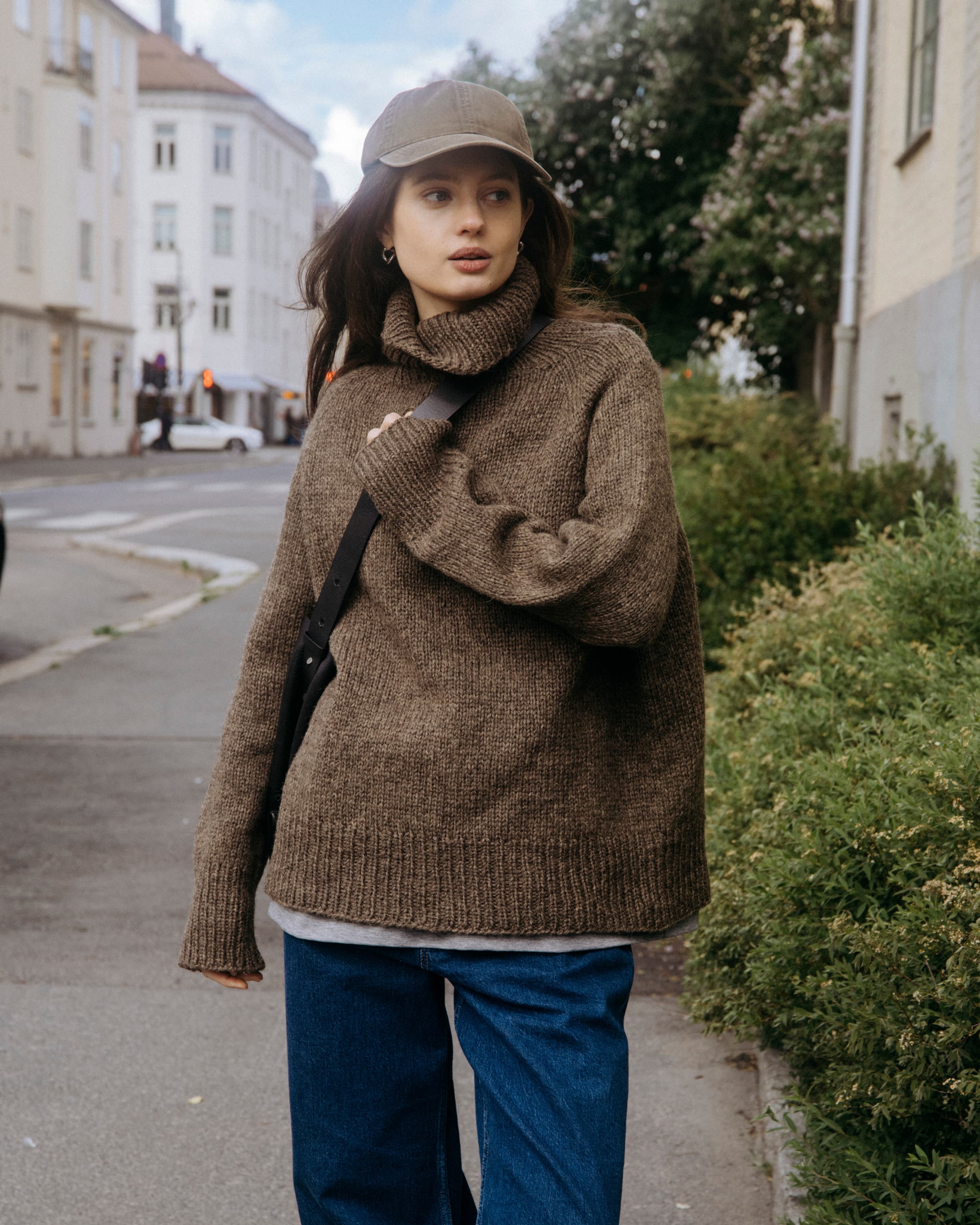 Heia raglangenser er en oversized og myk høstgenser i 100 % norsk ull. Den strikkes i Vams, et tykt og luftig garn, som gjør dette til et perfekt prosjekt for nybegynnere. En moderne basisgenser med høy hals og et snitt som passer de fleste. Du kan selv velge om du vil brette ned halsen, eller la den varme deg skikkelig på kalde dager.