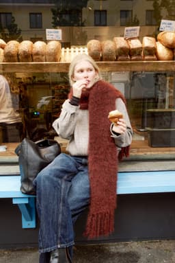 Heia mohairskjerf är en stor, mjuk och fluffig halsduk med tjocka fransar. Den är stickad med en tråd Tjukk mohair och en tråd Lamull tillsammans. Halsduken stickas fram och tillbaka i resårstickning. Lamullen gör halsduken stabil ochh den mjuka mohairen borstas upp så att halduken blir som ett fluffigt moln! Den avslutas med att man tvinnar och syr fast fransar i halsdukens ändar.