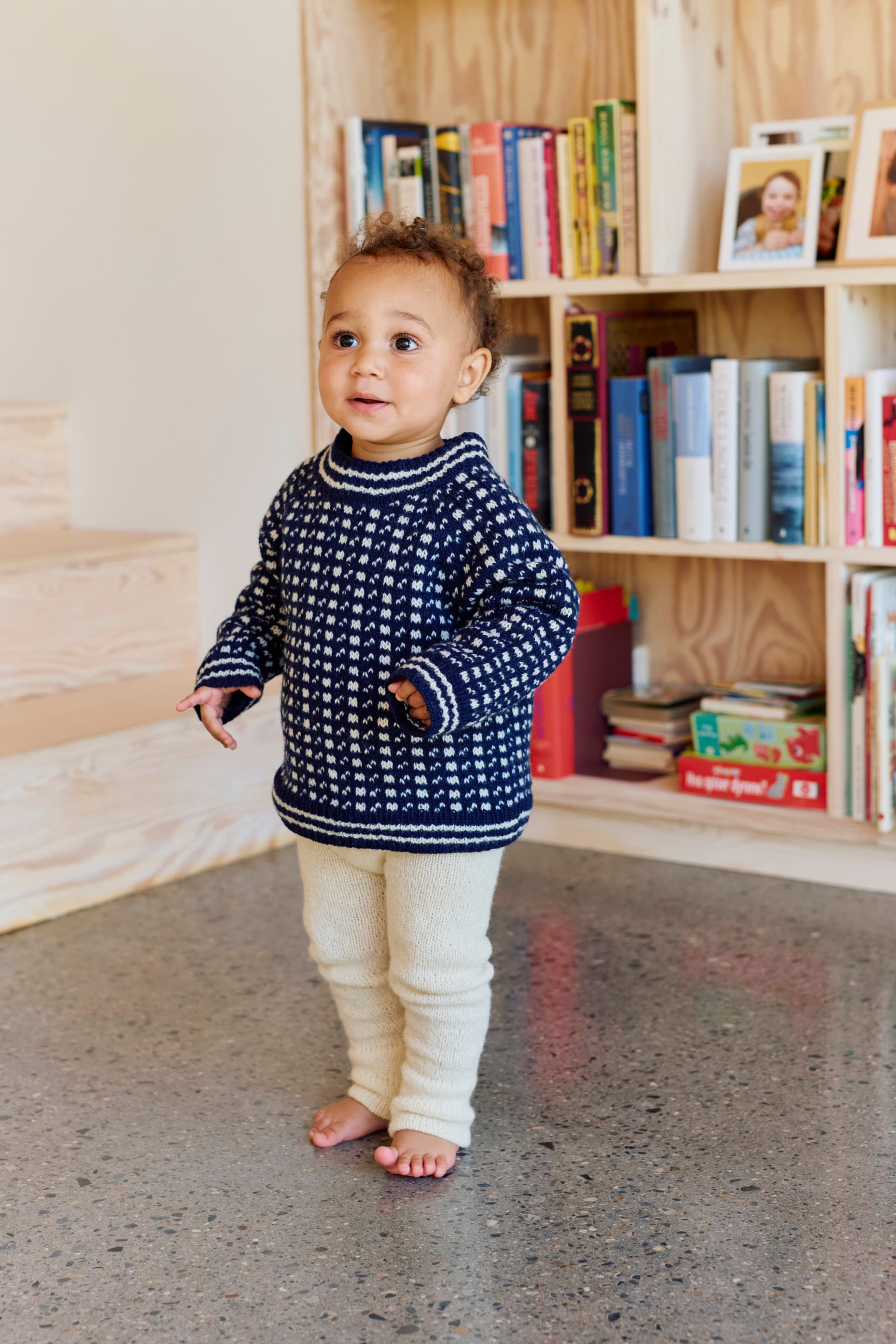 Islender er en klassiker vi aldri blir lei av. Den er tidløs og vakker i sin enkelhet, og uendelig sjarmerende på de små. Denne strikkes ovenfra og ned med raglanøkninger, vendepinner i nakken og en dekorativ bord mellom raglanøkningene. Strikket i myk, norsk Lamull, holder den på varme og fasong gjennom bruk, vask og arv. Dette er et plagg som varer, både i kvalitet og uttrykk, og passer perfekt til små eventyrere – uansett årstid.