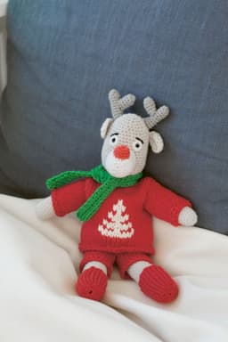 Rudolf er heklet i Pandora. Klærne er strikket i Petunia.