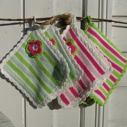 Pt 86-1326 - Grytekluter - Grytekluter med striper og heklet blomst(D)