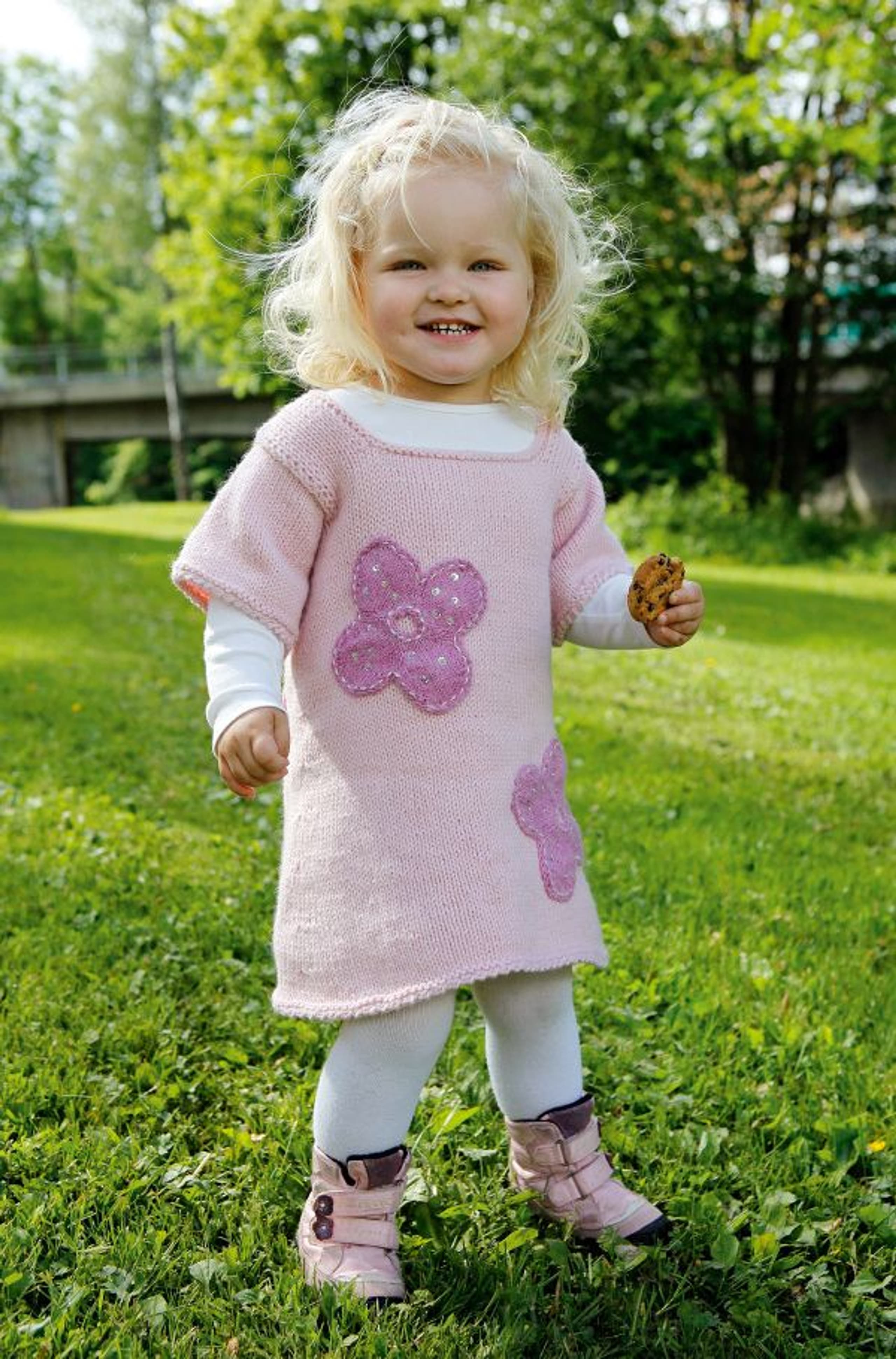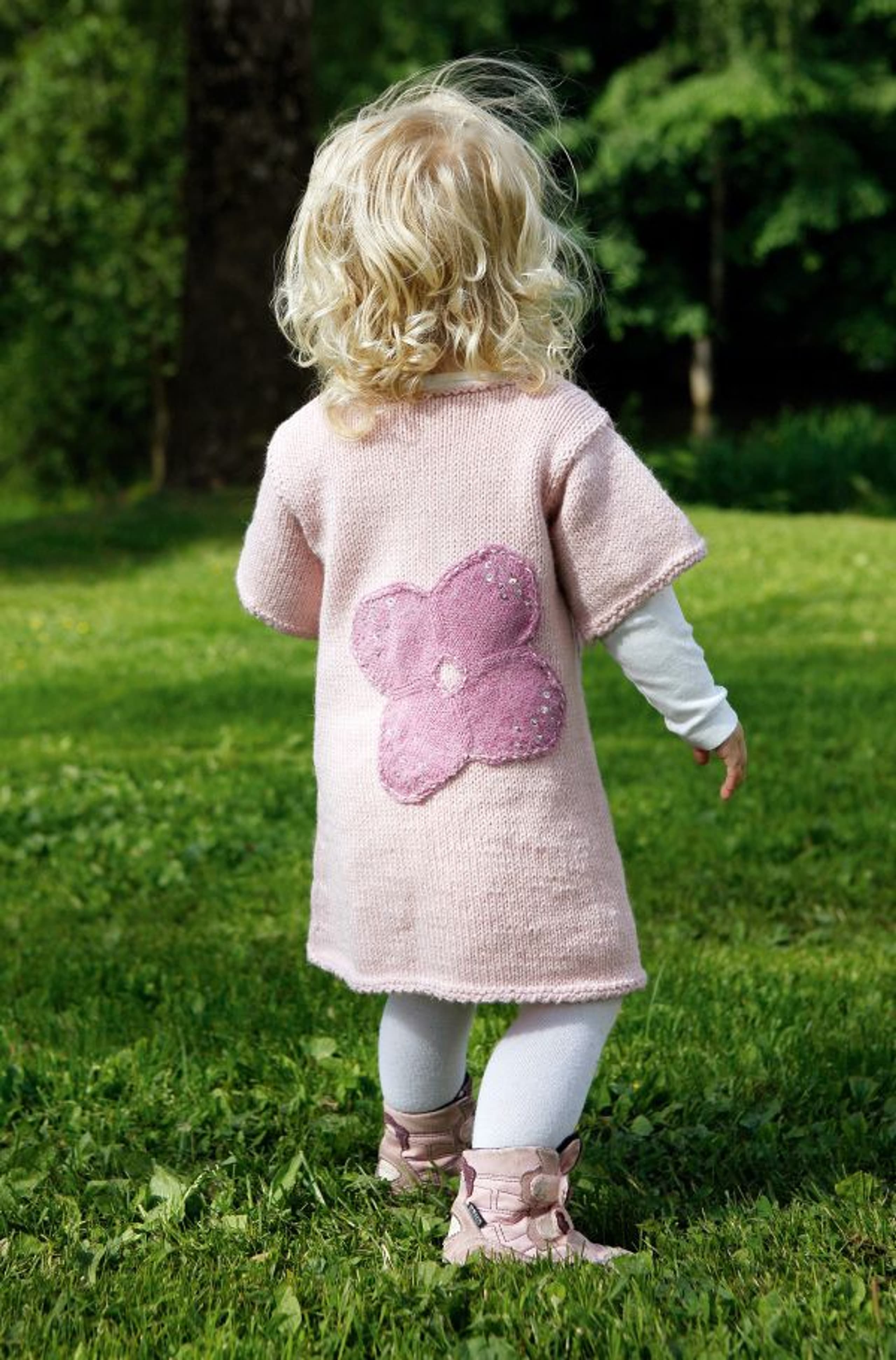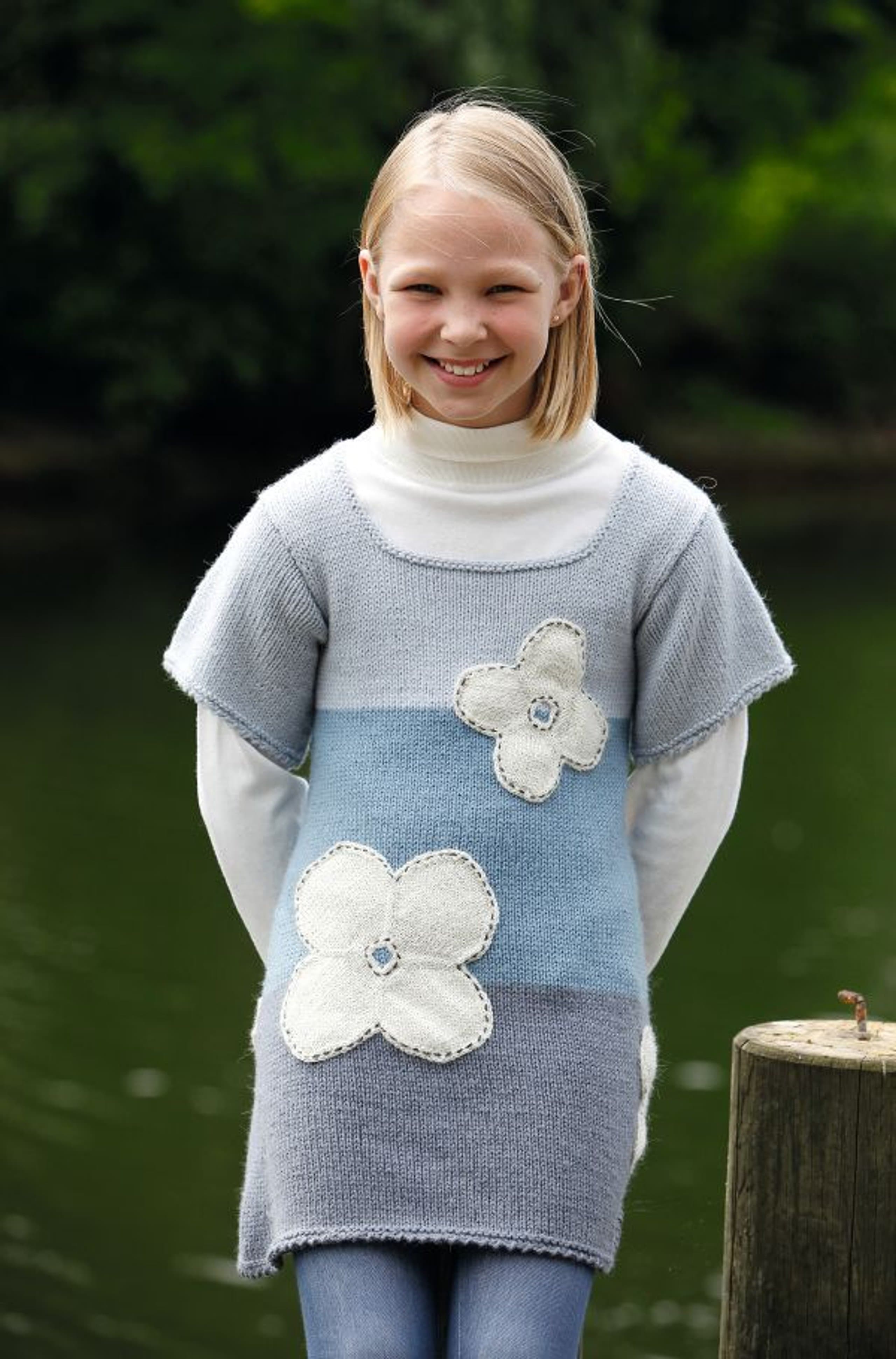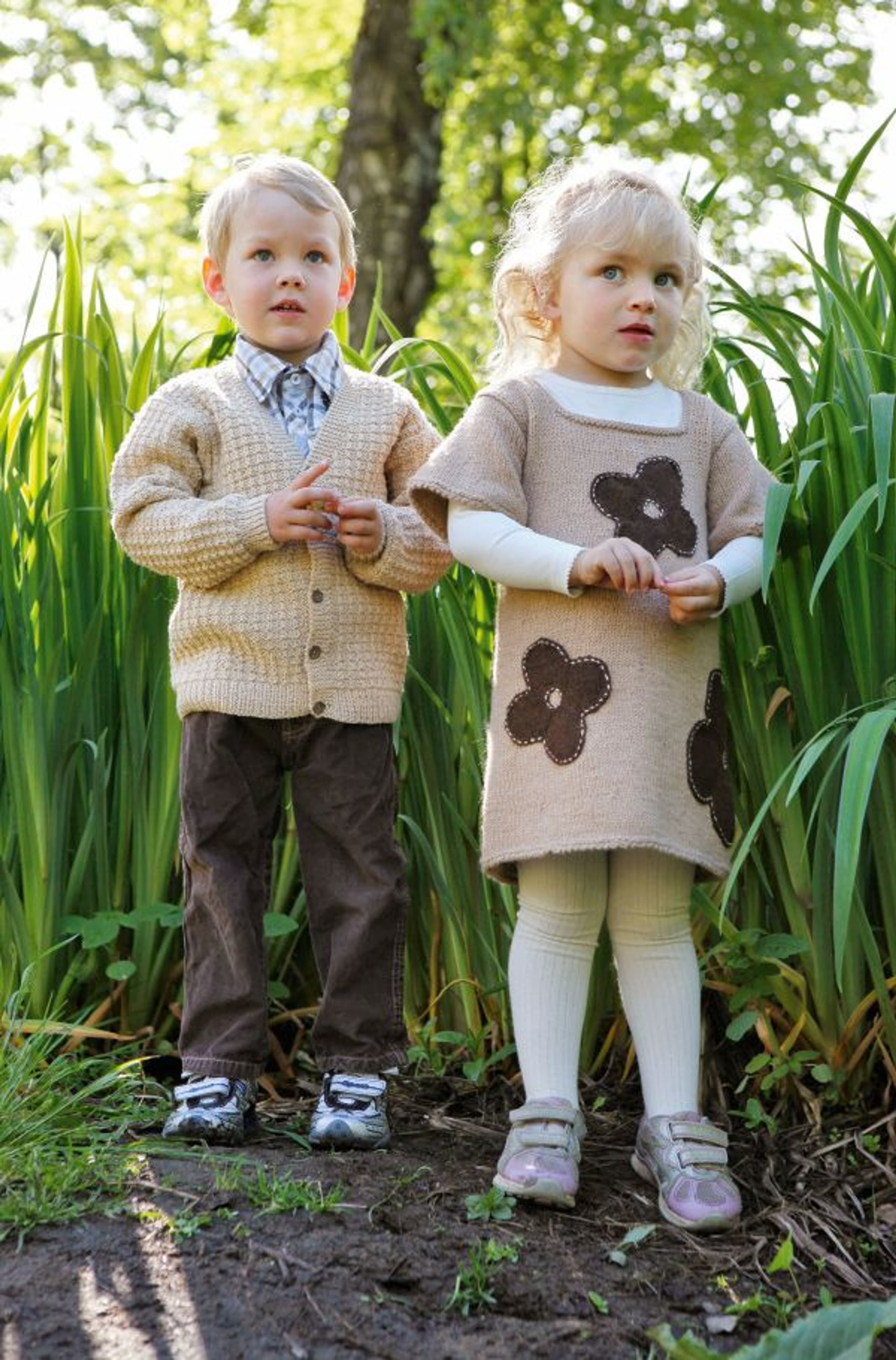 Genser med små blomsterborder og lue