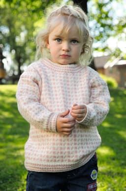 Genser med små blomsterborder og lue