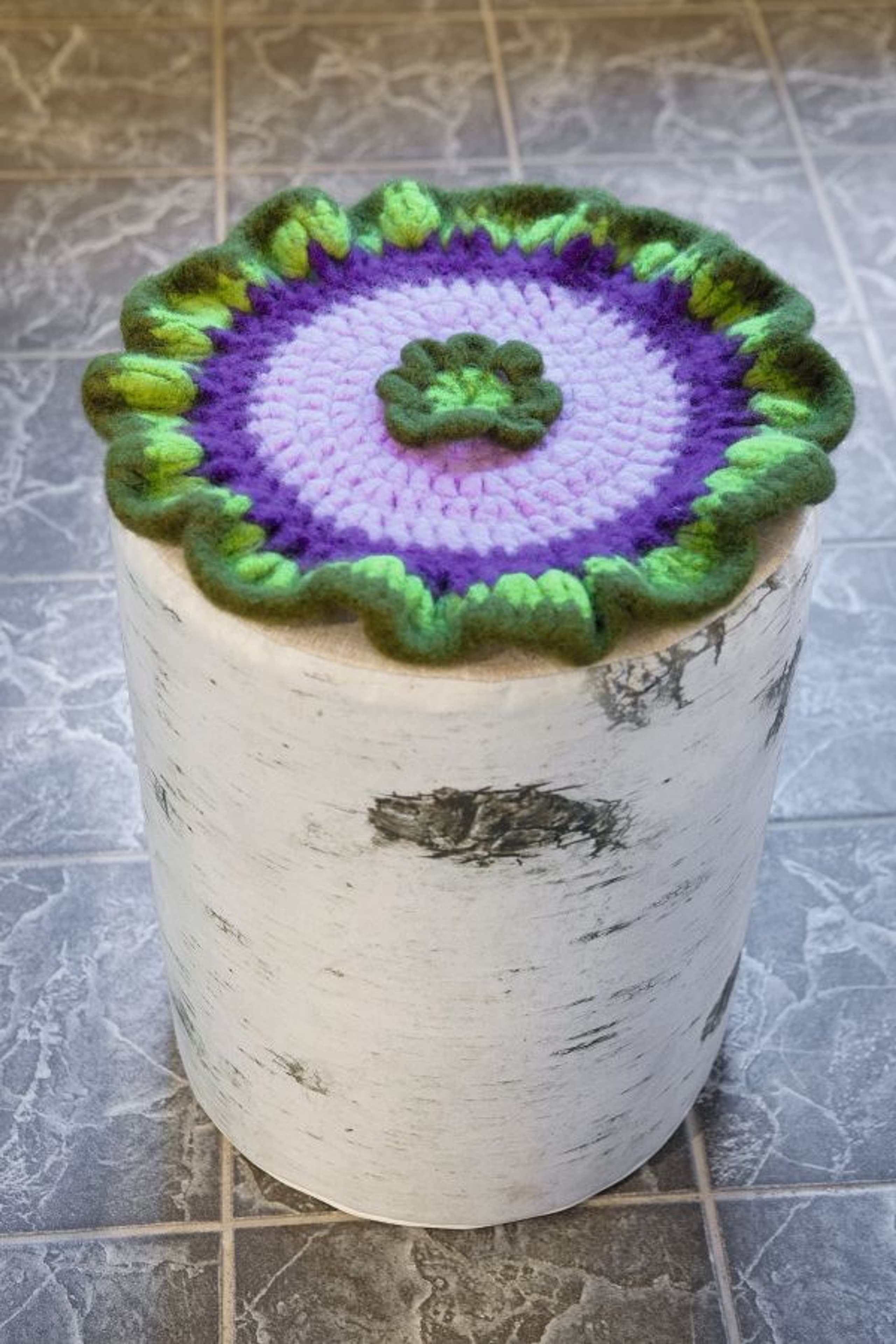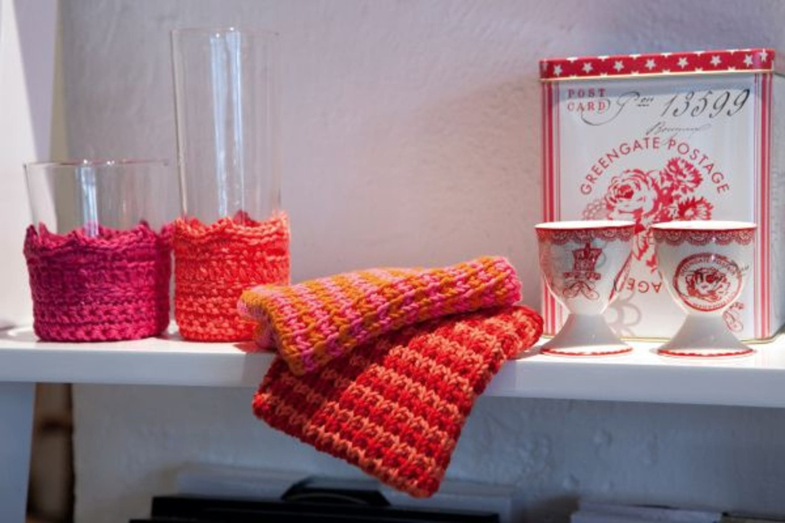Heklet spisebrikke, mansjett til serviett/bestikk og flasketrekk