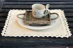 Pt Sumatra eller Pt Helårsgarn. 200 g holder til 1 brikke, 1 mansjett og 1 flasketrekk. Ønskes kun spisebrikken trenger du 150 g garn. *Mål:* **Brikke** ca 37 x 44 cm. **Flasketrekk** omkrets ca