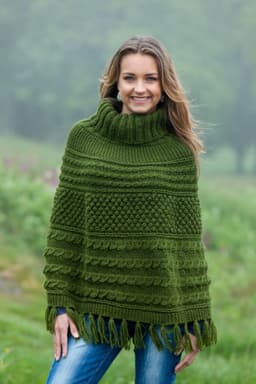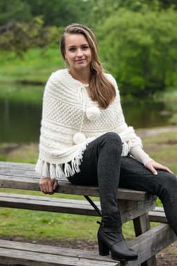 Poncho med fletter og høy hals eller pomponger