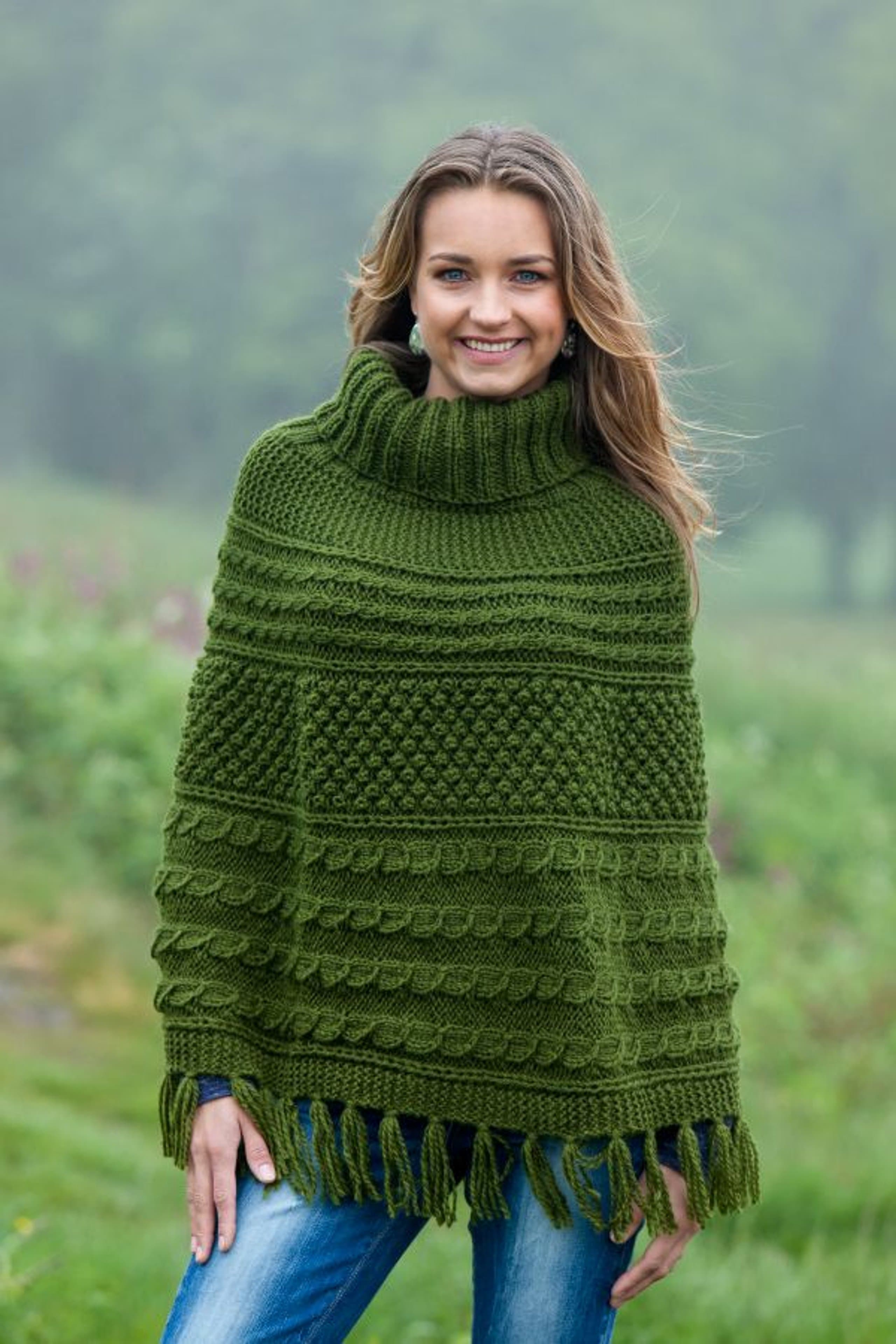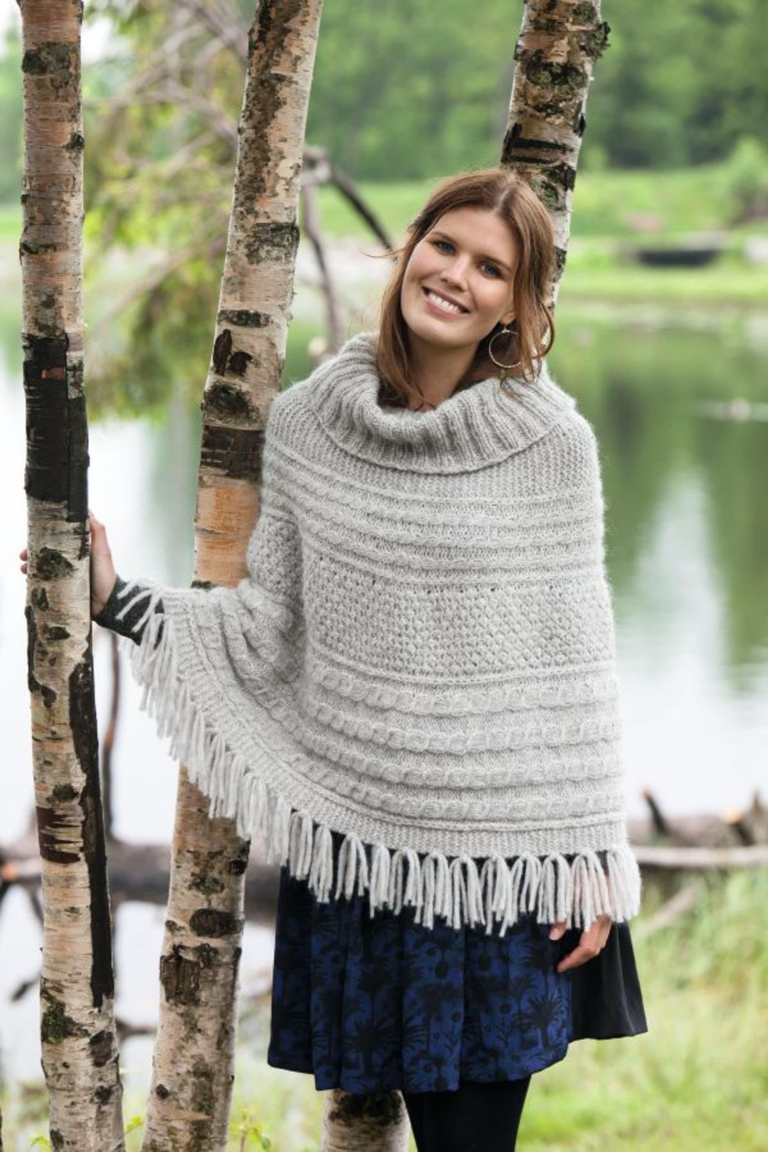 Poncho med fletter og høy hals eller pomponger
