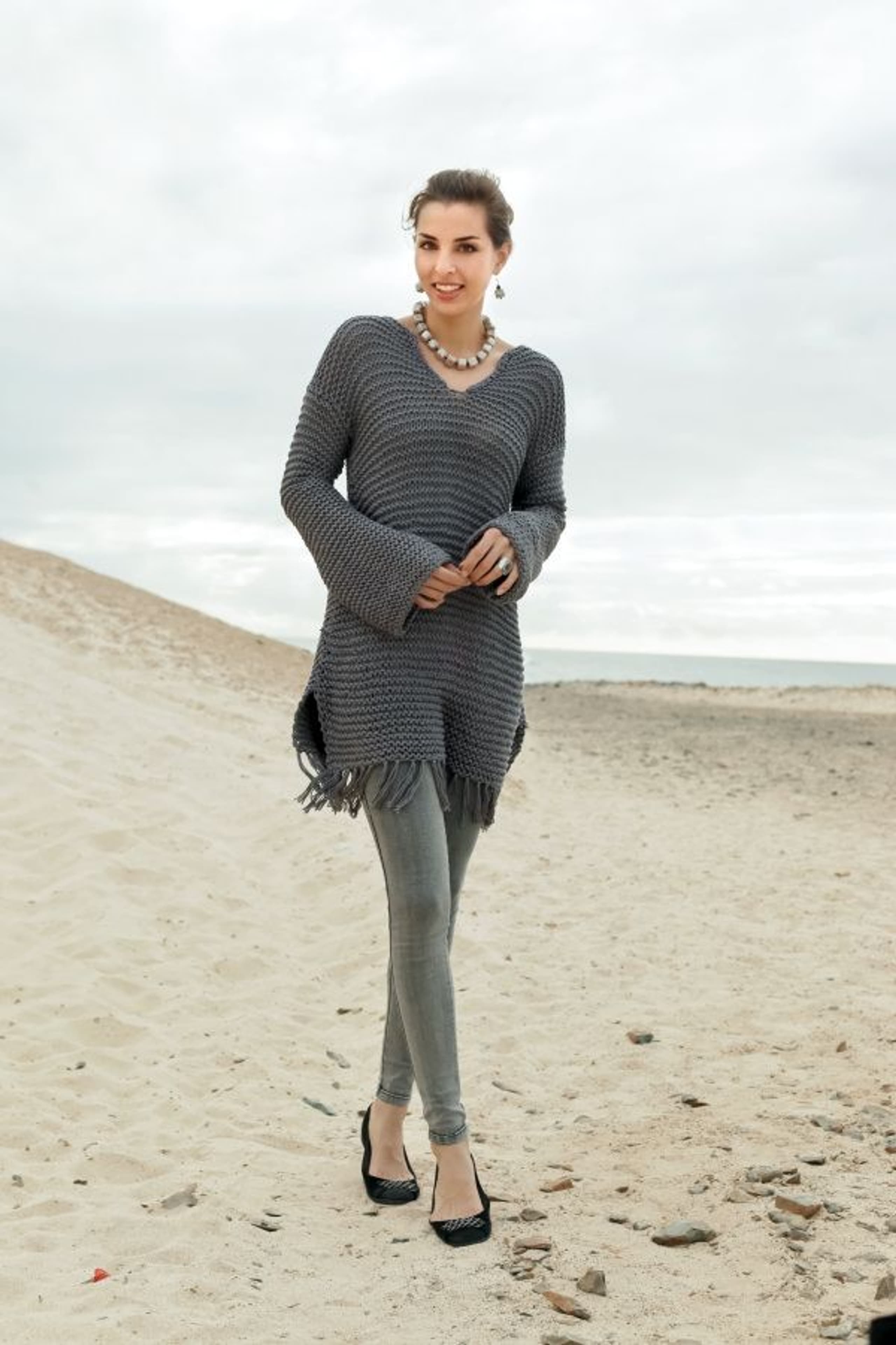 Lang genser med riller og frynser