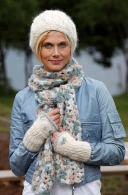 Heklet skjerf, strikket lue og pulsvarmere. Skjerf: 150 g av fg Iris. Lue og pulsvarmere: 150 g av Iris