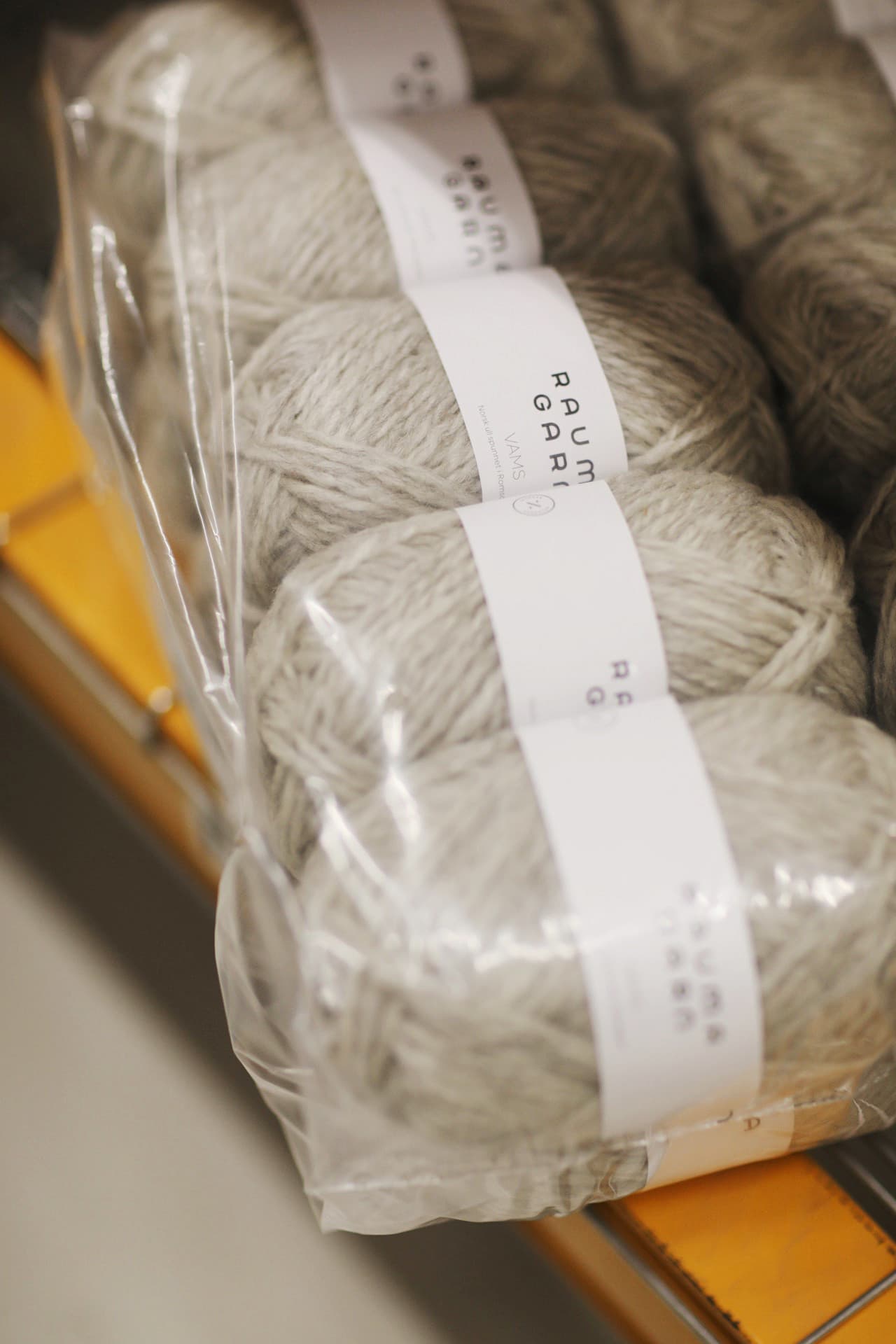 Vi nøster opp garnet til garnnøster. Banderolene blir satt på og nøstene pakkes og fraktes til lageret.