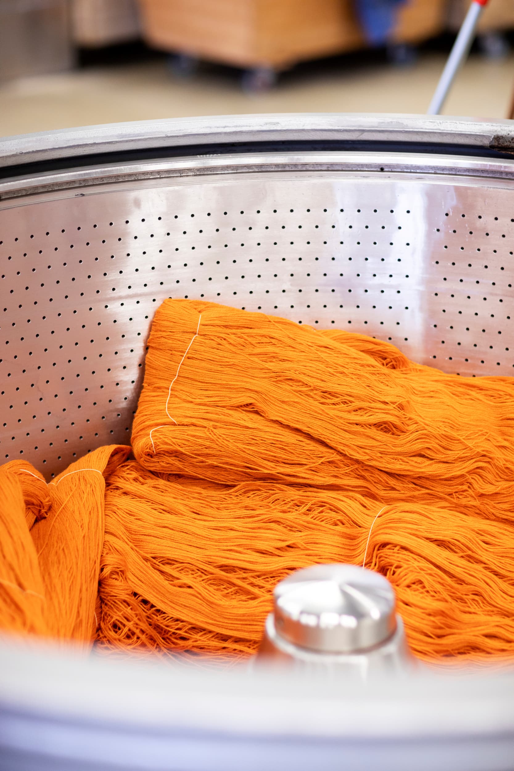 Når garnet kommer ut av fargeapparatene, er det helt gjennomvått og må sentrifugeres.